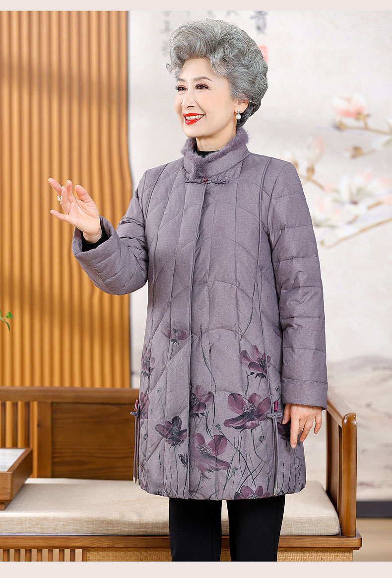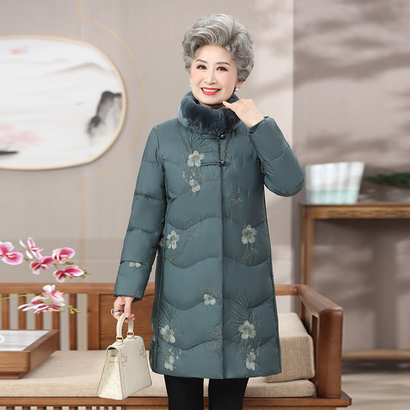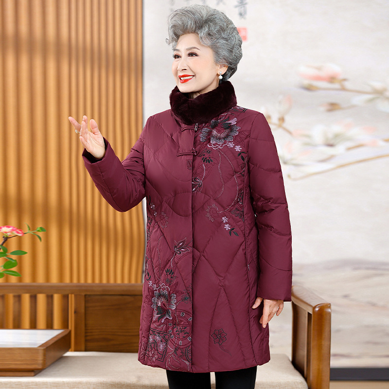 中高年のお母さんの冬服のダウンジャケットの中の長いタイプの老人服のおばあさんの毛の襟の国風の重工の刺繍のコートの女性