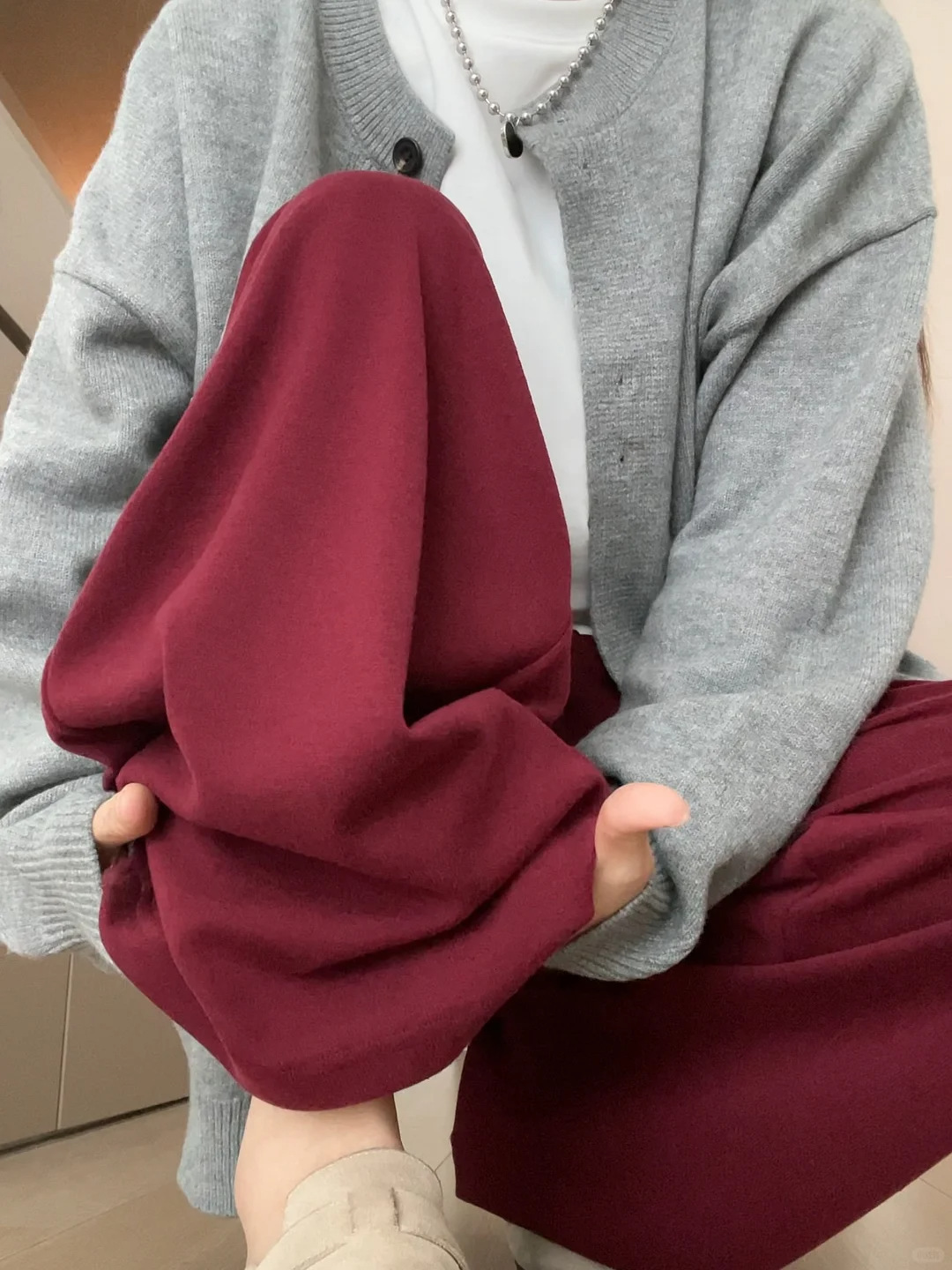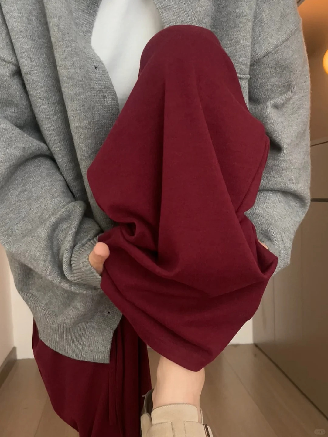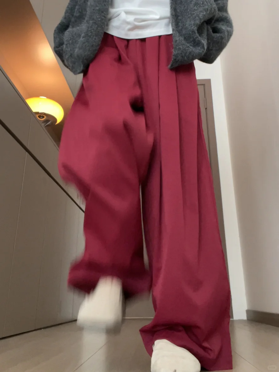 アンコラレッドワイドレッグパンツ レディース 秋冬新作 ゆったりBF風 ゆったりカジュアル 小柄さん向け ニットもち米パンツ ハイウエスト