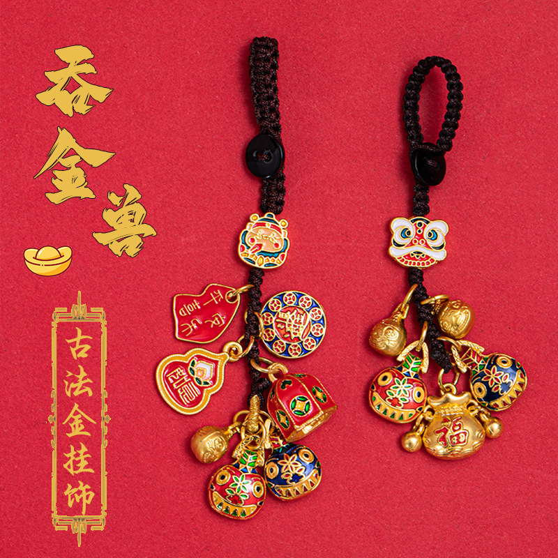 古法金呑金獣財神一家三口エナメルキーホルダー国潮ストラップ覚醒獅子沙金ペンダントストラップ