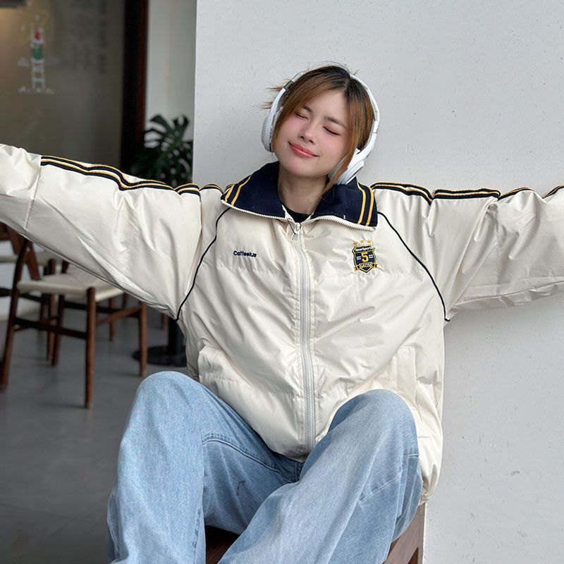 学院風デザイン感アルファベット刺繍ブルーパン服コート女性冬新型保温防寒純色綿服