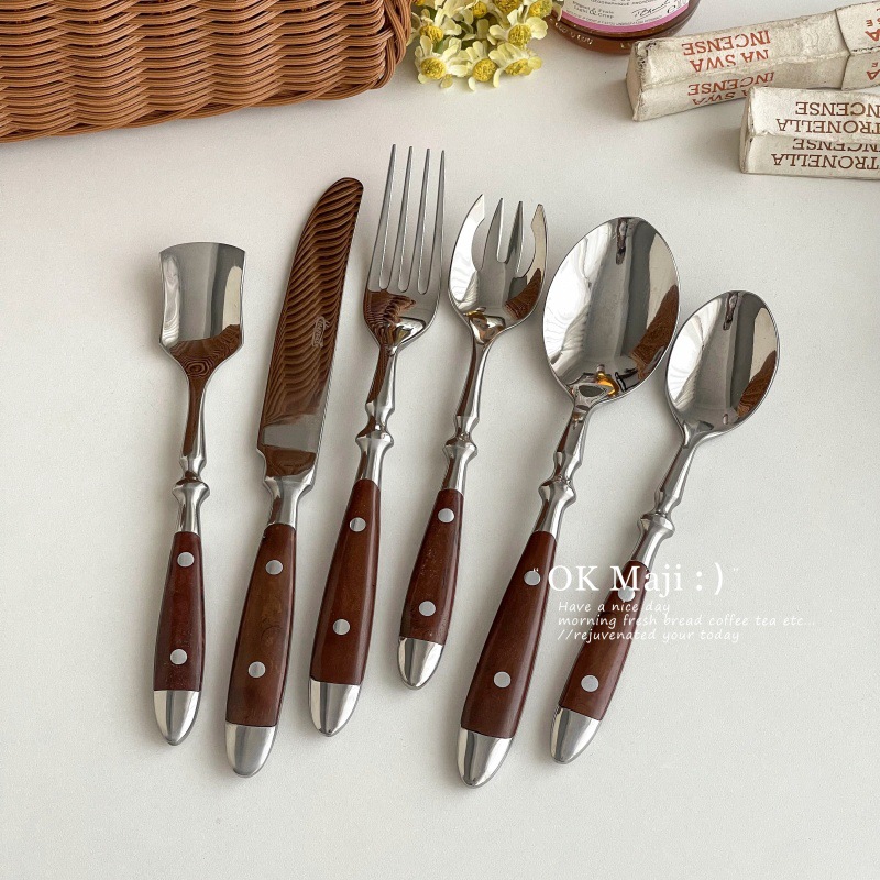 ステーキ食器、家庭用ステンレスナイフ、フォーク、スプーン、レトロデザートスプーンとフォーク、洋食器セット、コンプリートセット