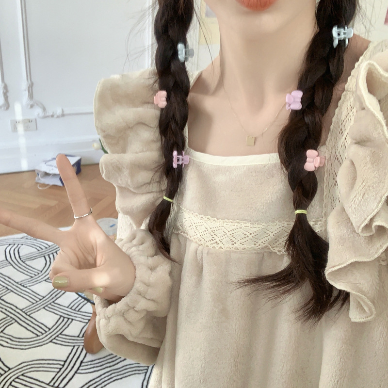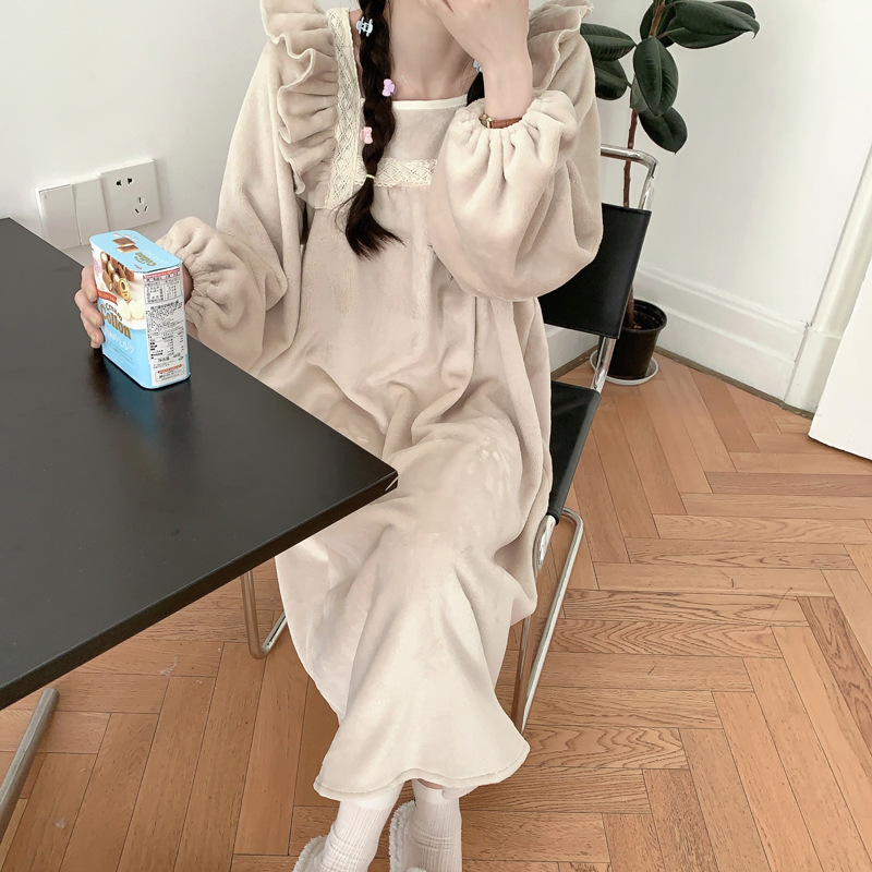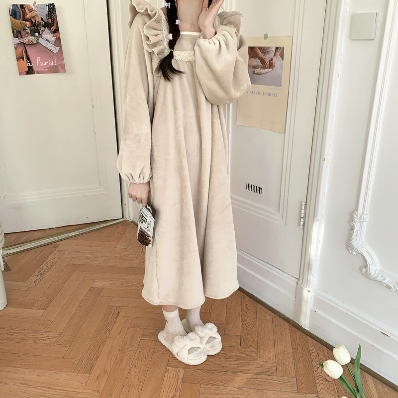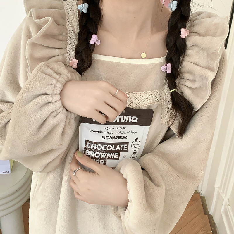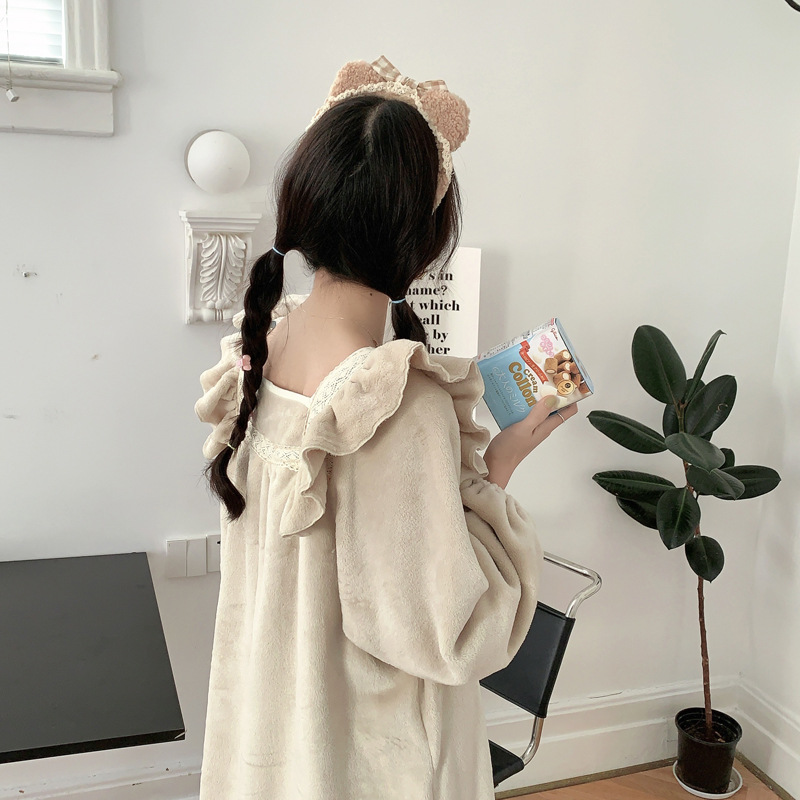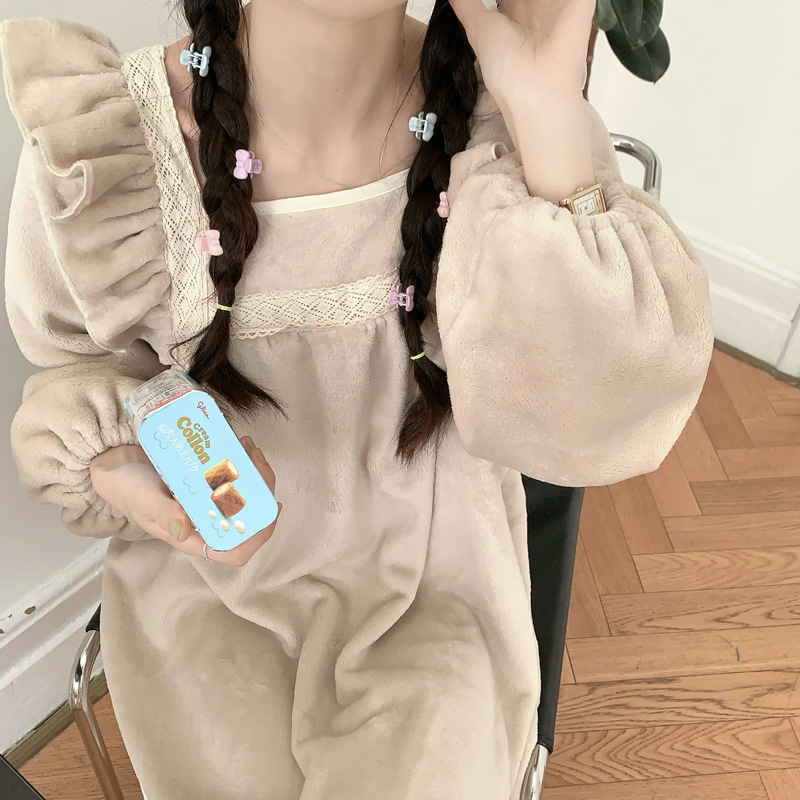 韓国insさん冬の新しいパジャマの襟とベルベットの厚いハスの葉の縁の純色の長袖の家庭服のパジャマ