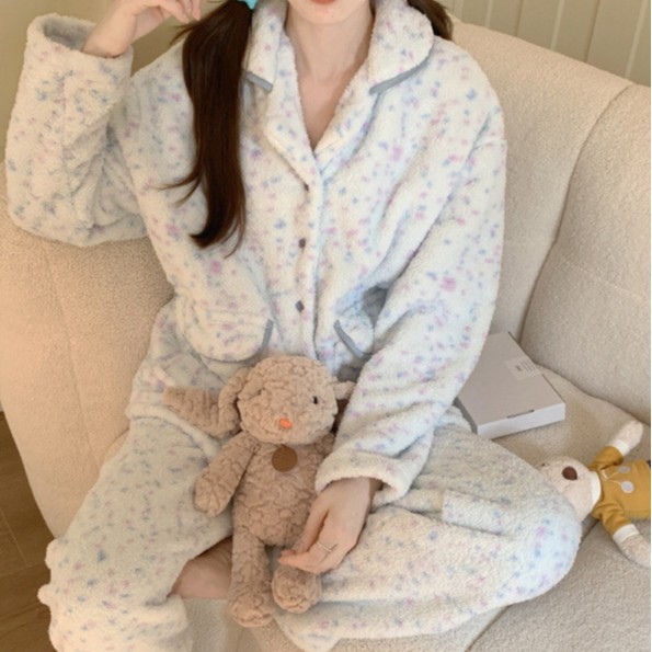 韩国ins女士2色新品喊吧加厚毛绒 韩系少女ins碎花家居服睡衣套装