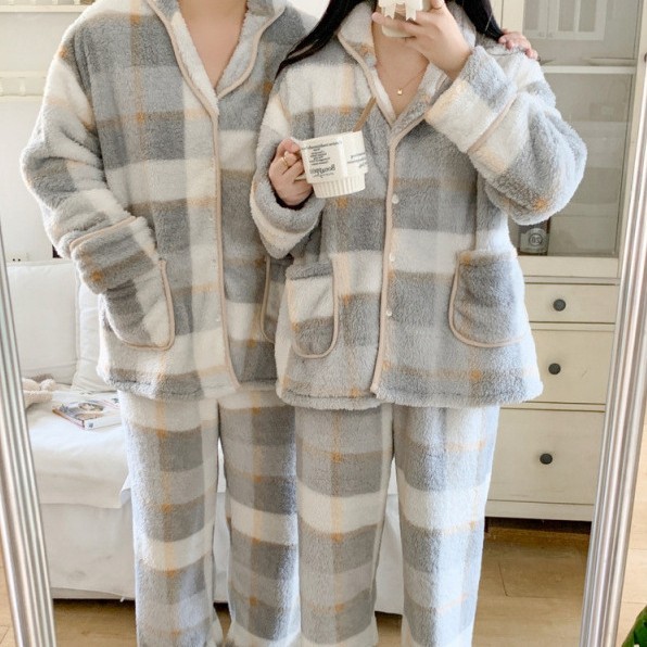 韩国ins保暖毛绒情侣格子睡衣可外穿遛弯家居服长袖长裤套装女士