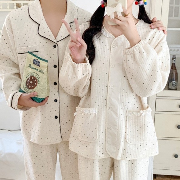 韩国ins女士情侣睡衣加厚夹丝棉家居服波点韩版ins长袖圆领套装女