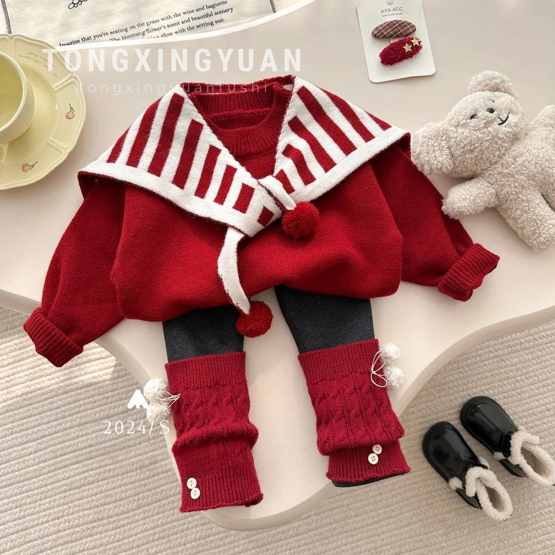 童星園新年レッドセーター2025秋冬重ね着ショールニットトップス女の子セット韓国風トレンド