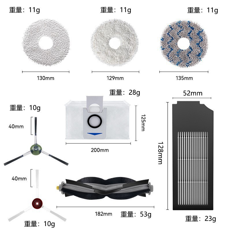 グレーサイドブラシ1組,白いサイドブラシ1組,ローラーブラシ1本,黒フィルター2枚(1箱),黒いクリップカーボンフィルター1個,白色フィルター1枚,白色クリップカーボンフィルター1個,青とグレーの布 1 枚,白い布1枚,灰色の布1枚,ダストバッグ1個,クリップカーボンダストバッグ1個,ブルーウィンドチャイム洗浄液(1L)1本,ブルーウィンドチャイム洗浄液(2L)1本,抗菌洗浄液(1L)1本,抗菌洗浄液(2L)1本,洗浄液の小さなボトル 1 本 (80ml),青いクリーニングブラシ 1本,1 モップモジュール,黒いダストボックス1個,ホワイトダストボックス1個,黒いローラーブラシカバー1個,白いローラーブラシカバー1個,1 個の徐放性銀イオンモジュール,白色銀イオンモジュール 1 個,1 個ブラック銀イオンモジュール,1 セットの敷居ストリップ,1 しきい値ストリップ延長スプライス