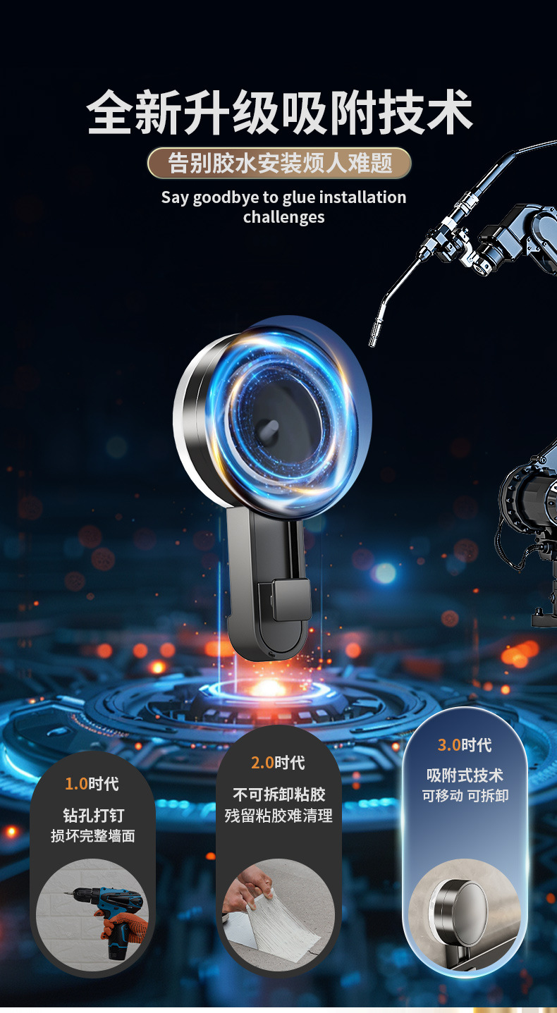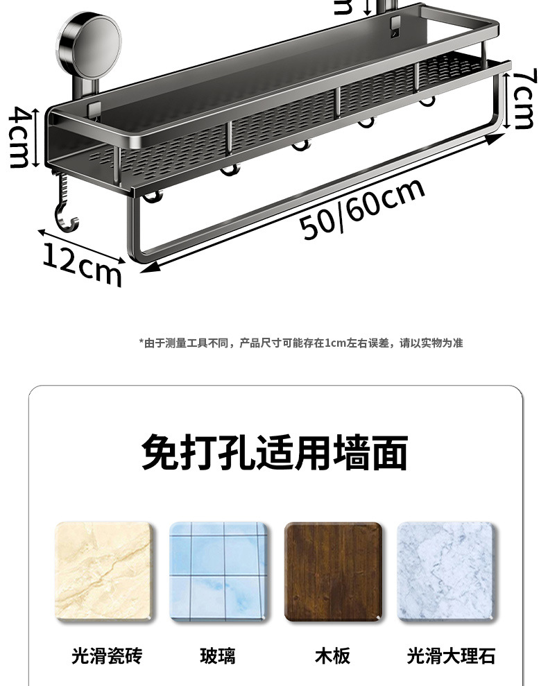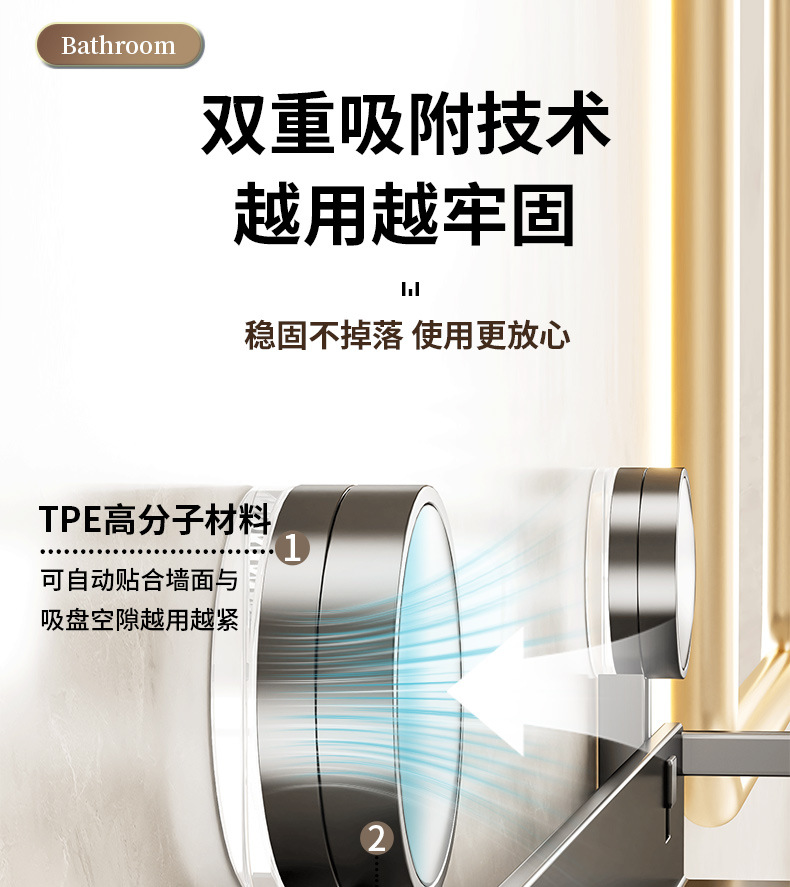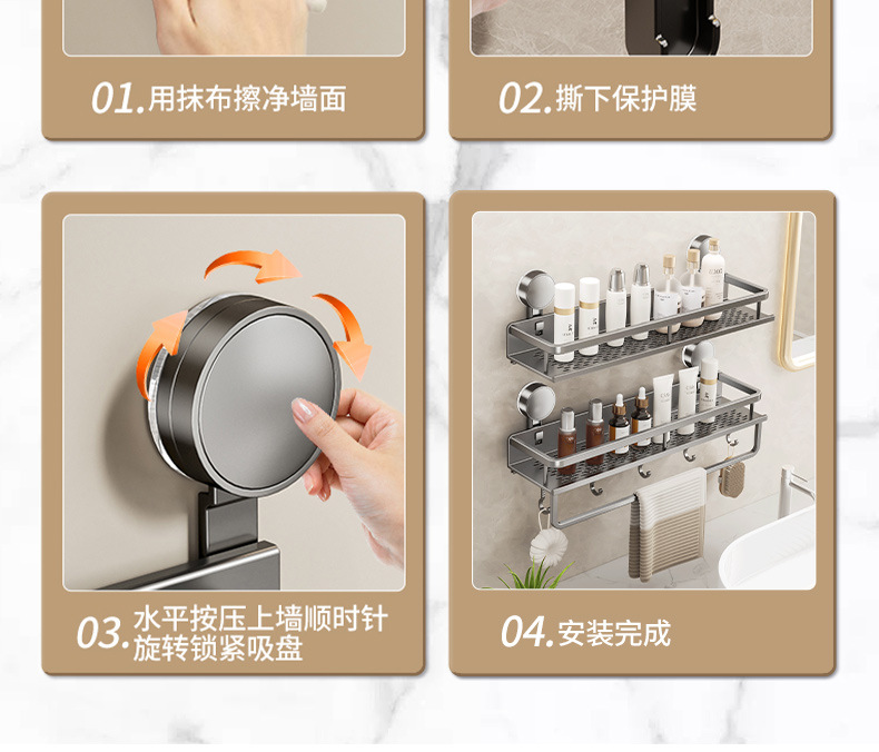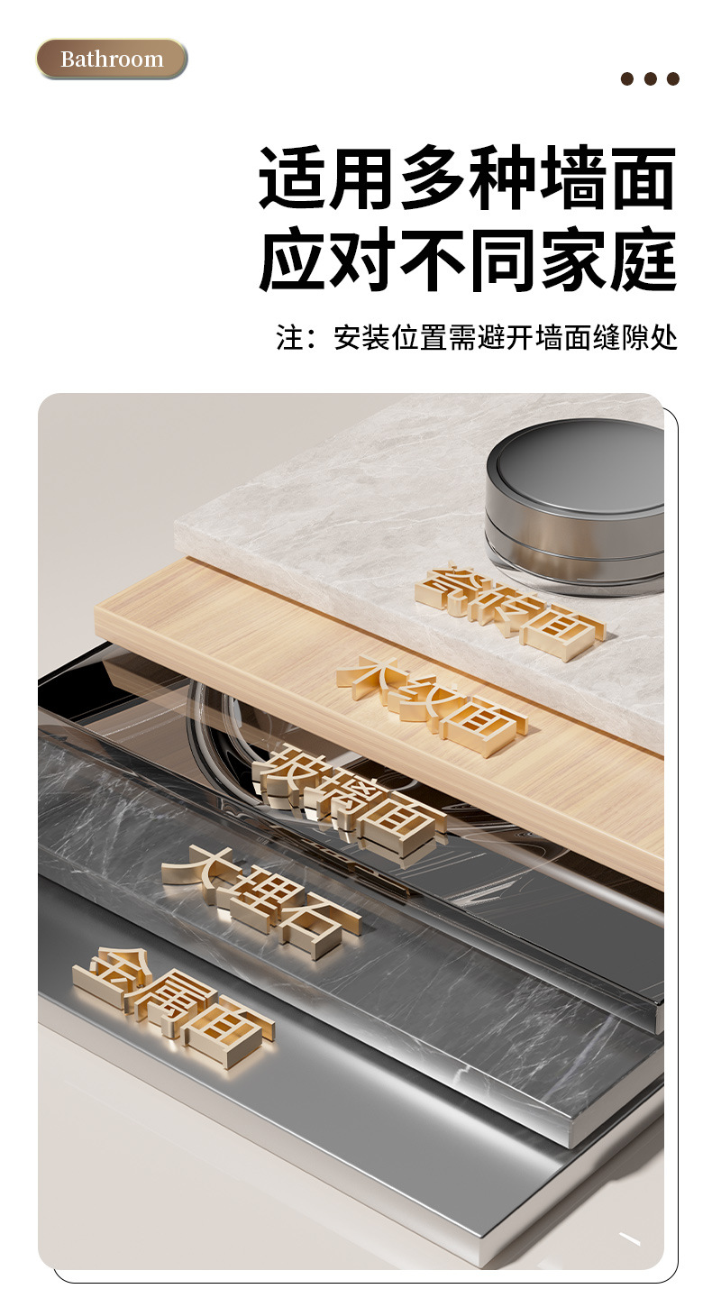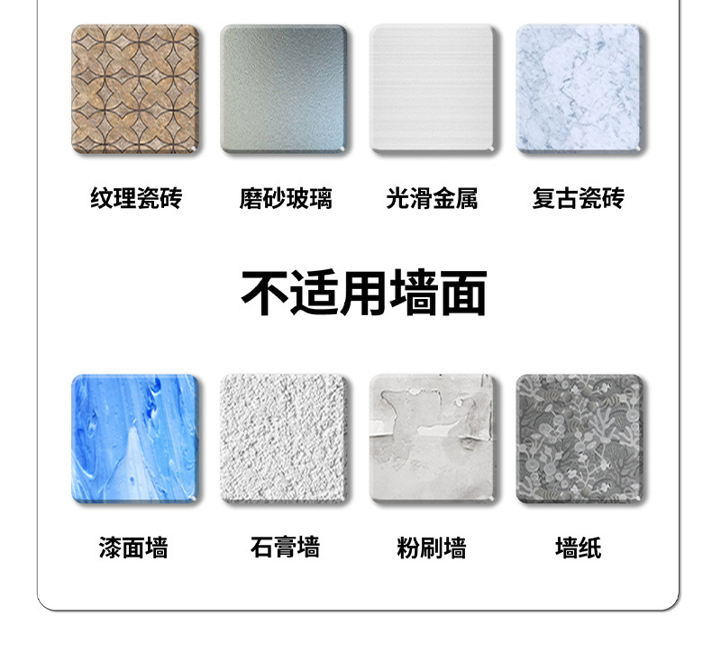 (2)安装请注意,墙面需平整坚固的玻璃瓷砖等。不可用在粉刷墙,墙纸,石灰墙等不平整不坚固的墙面上。