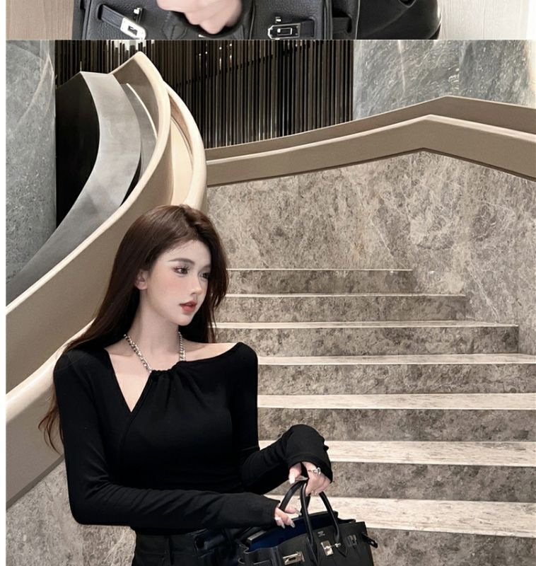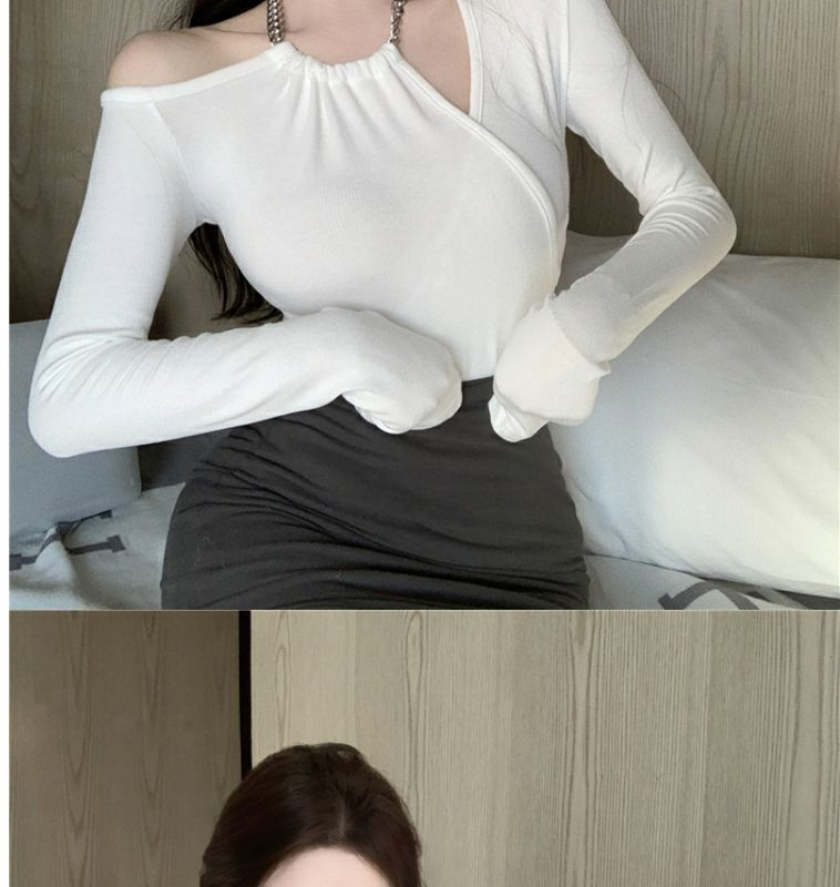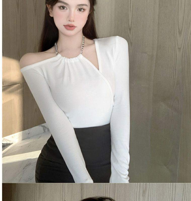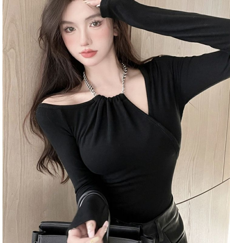 秋のセクシーなギャルの純欲風の肩のチェーンは首の長袖のtシャツを掛けてスリムに見えます。