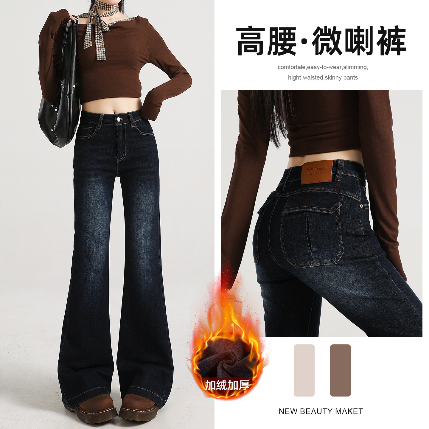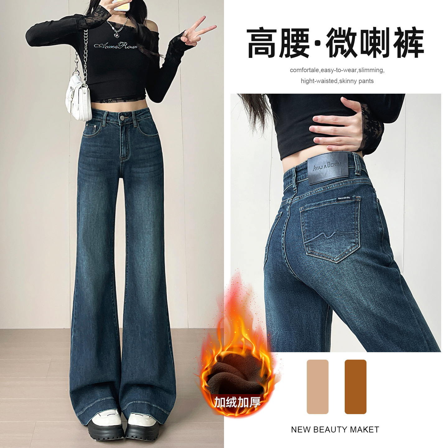 复古蓝微喇加绒牛仔裤女秋冬季2025新款高腰显瘦不贴腿马蹄喇叭裤