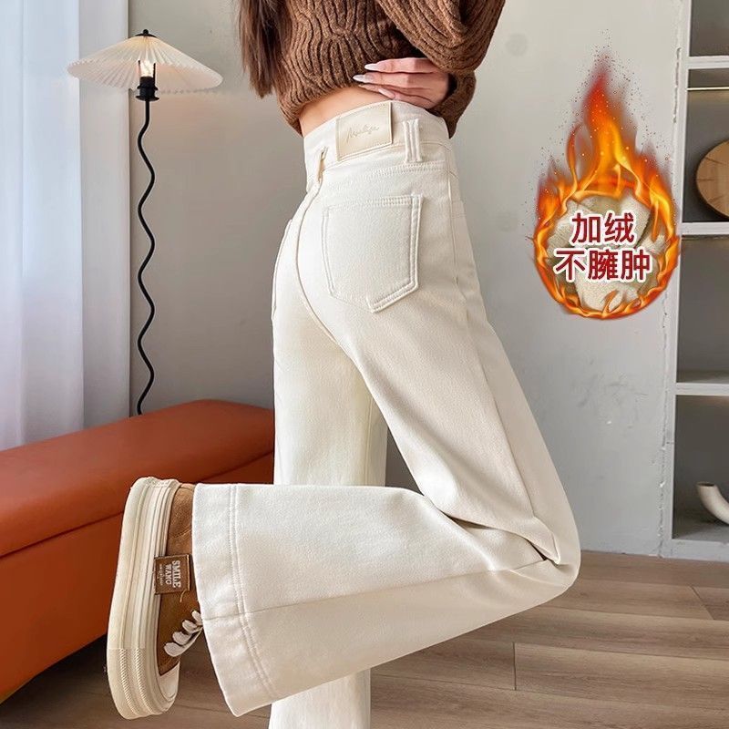 加绒微喇牛仔裤女秋冬季2025新款梨型身材宽松显瘦白色阔腿喇叭裤