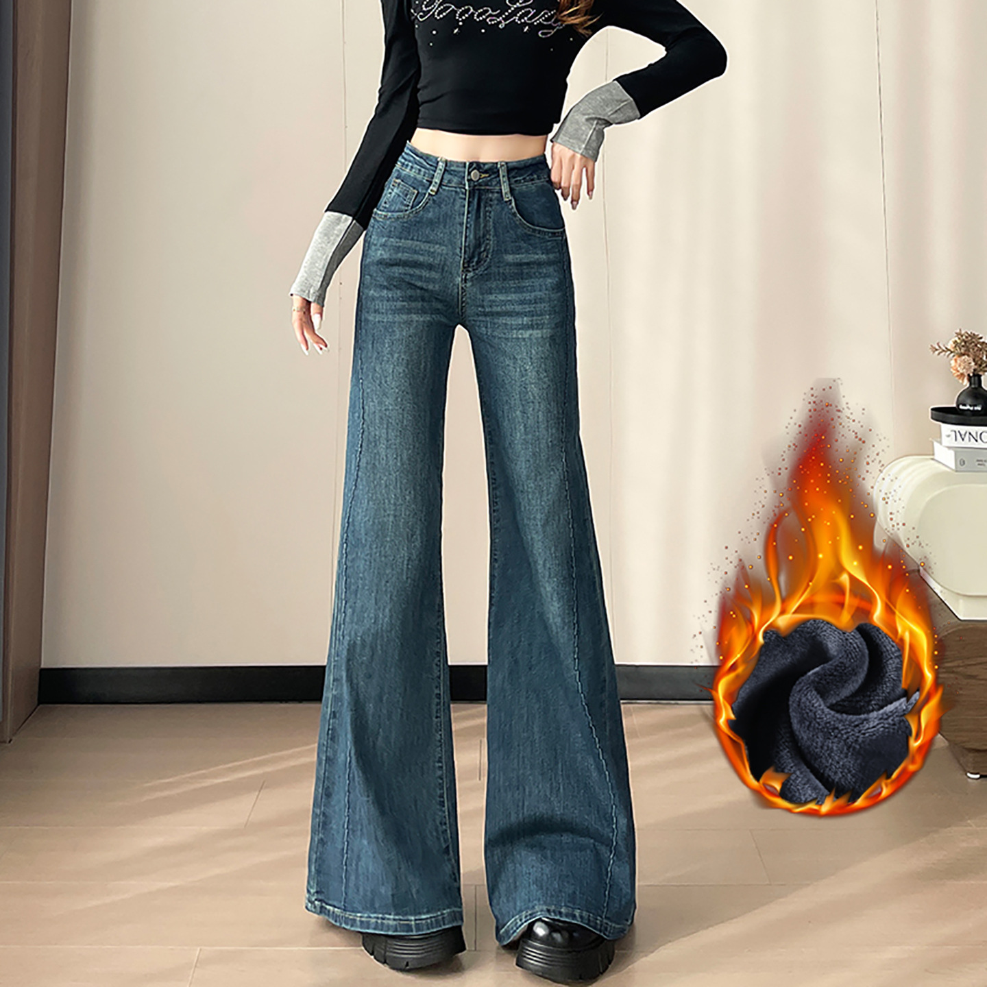 アメリカンレトロ風ブルーワイドレッグ裏起毛デニムパンツ レディース 秋冬2025新作 ハイウエストゆったりロング丈パンツ