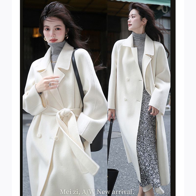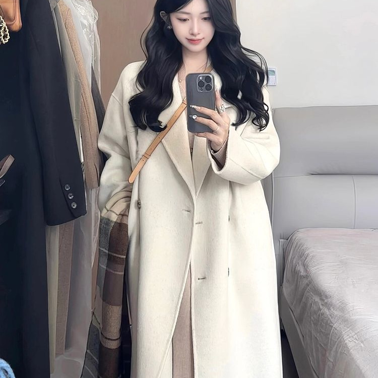 2025秋冬中长款上档次单层毛呢外套女米白色新款小个子呢子大衣潮