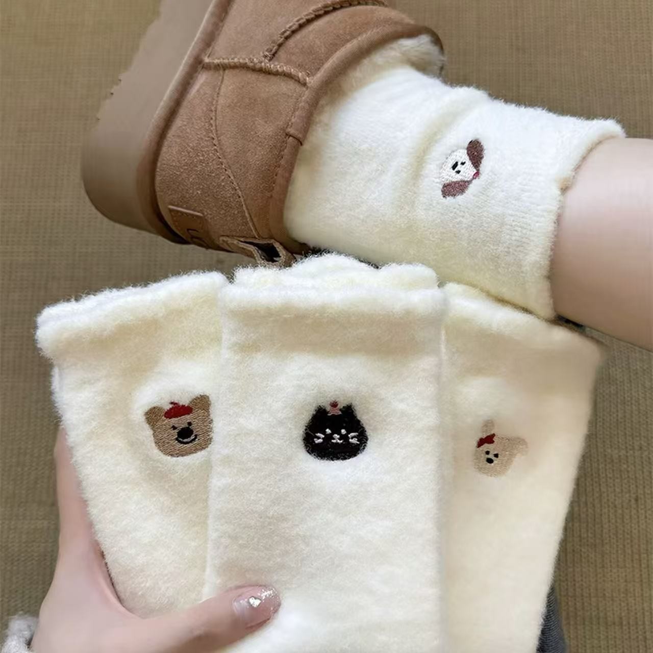 袜子女白色毛绒绒中筒袜冬季加绒加厚澳绒小狗刺绣保暖可爱批发