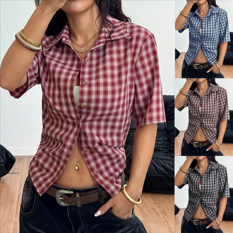 欧美跨境亚马逊爆款 2026春夏季女士新款格子五分袖上衣衬衫女装