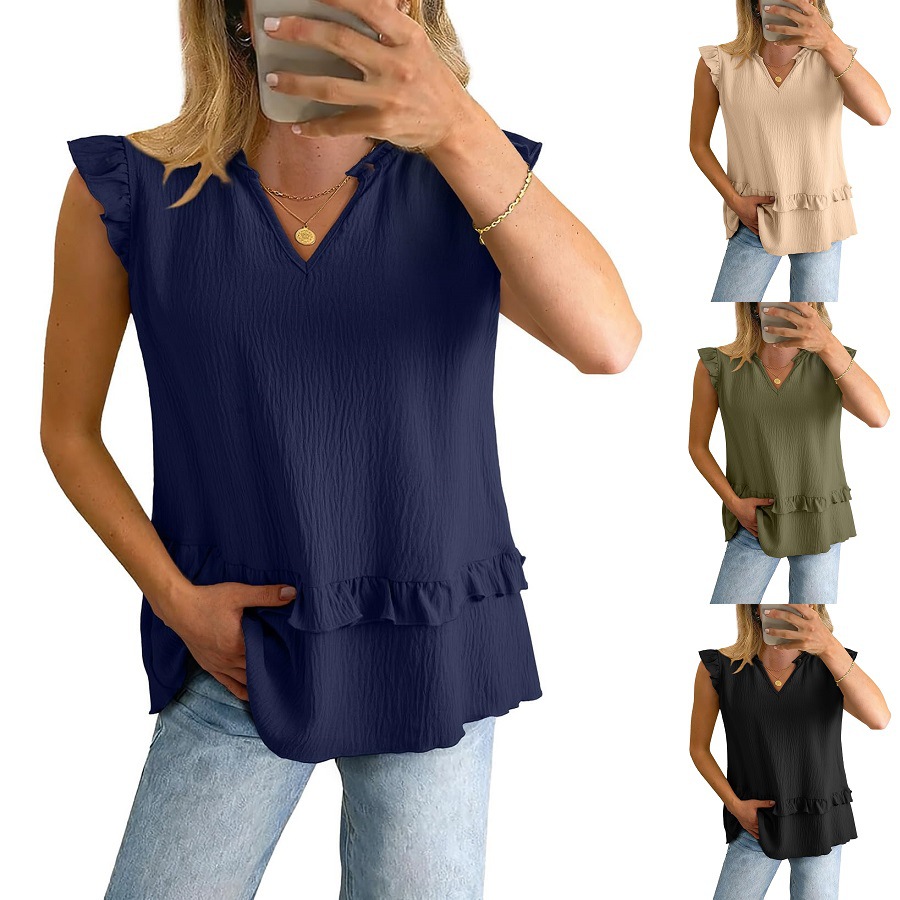 2026跨境欧美 女装亚马逊夏新款无袖上衣 V 领荷叶边宽松休闲衬衫