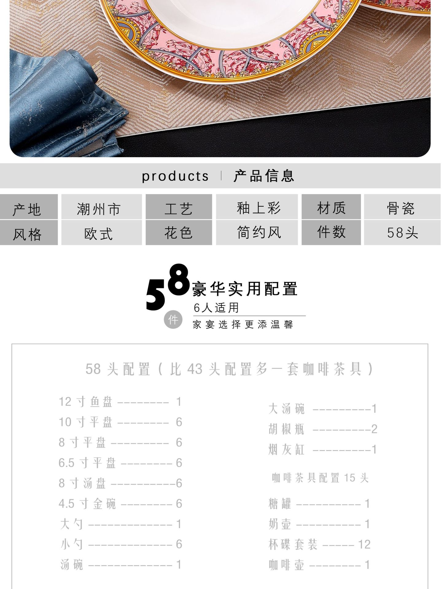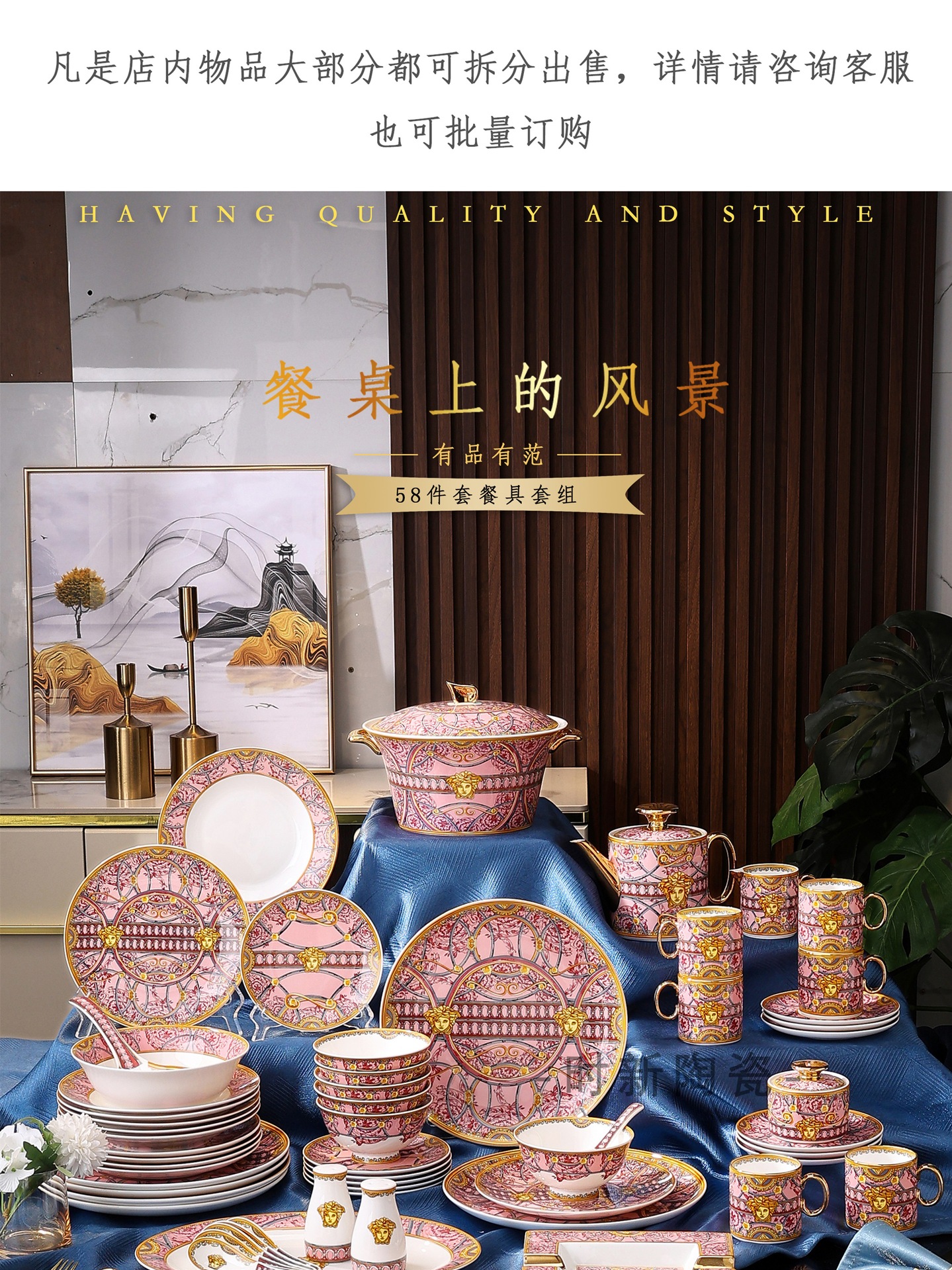 爱马家欧式简约黑线条轻奢骨瓷餐具58头配置碗碟盘组合套装礼盒装