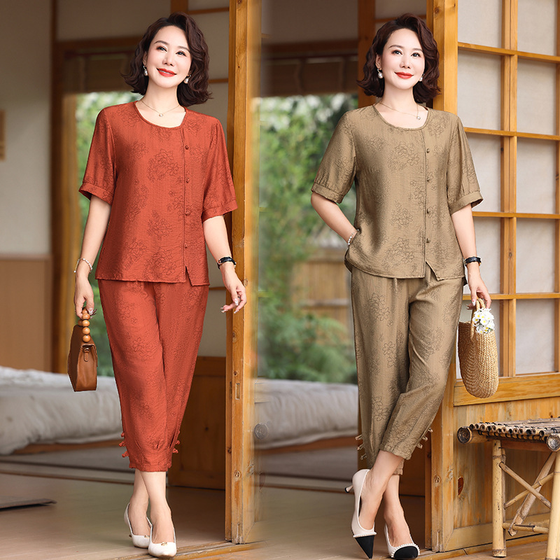 中年お母さん春秋服カジュアルスーツ秋2025新作中高年女性春秋カジュアル二点セットプリント