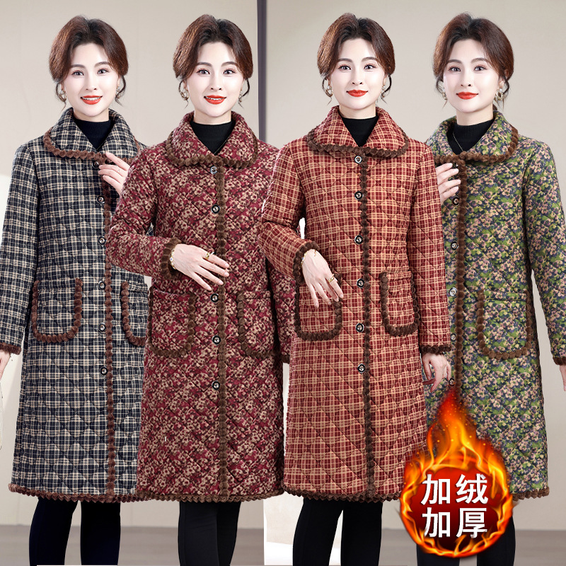 中老年奶奶保暖棉袄冬装加绒加厚翻领棉服妈妈中长款格子棉衣外套