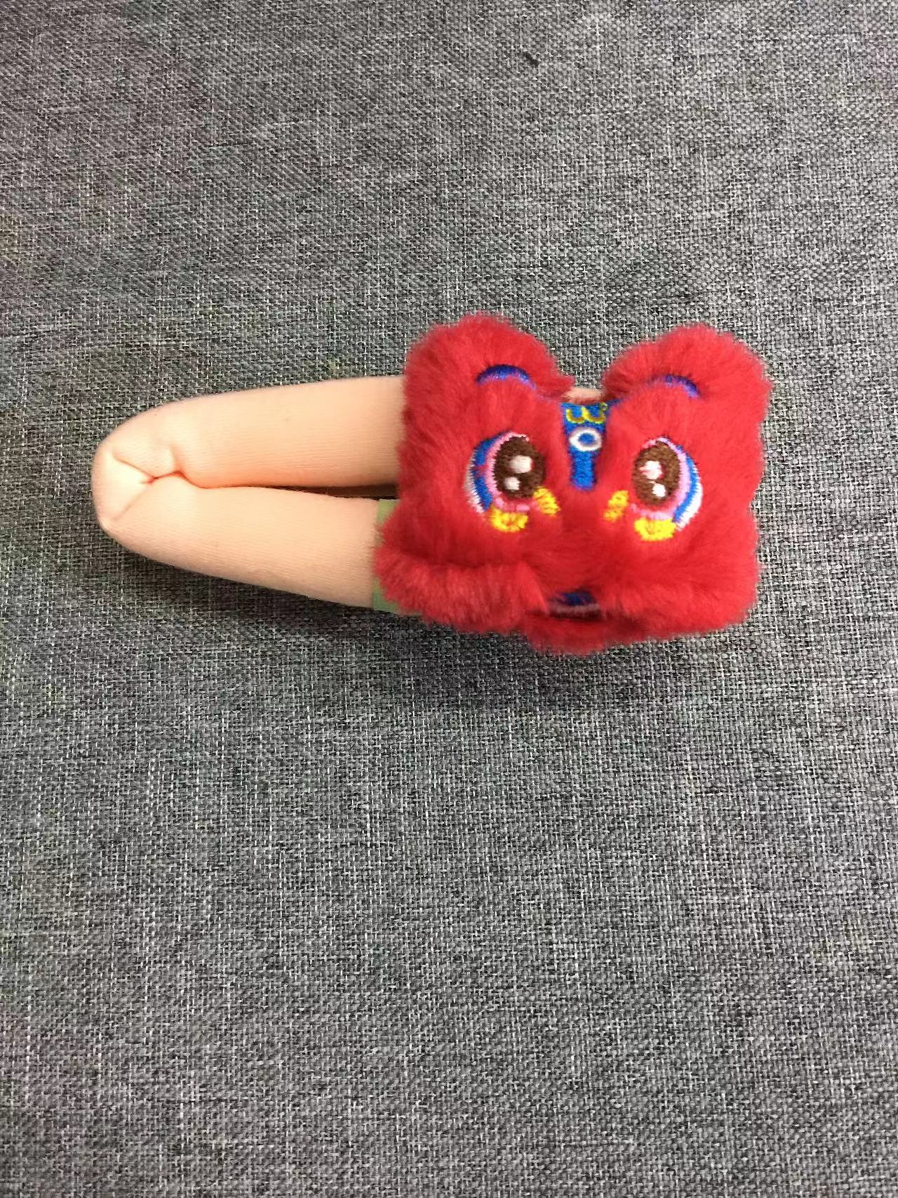 新年のプレゼント目が覚めたライオンの髪飾りがかわいいぬいぐるみの子供の髪が龍年のお祝いの前髪を挟んで新年の髪飾りをします。