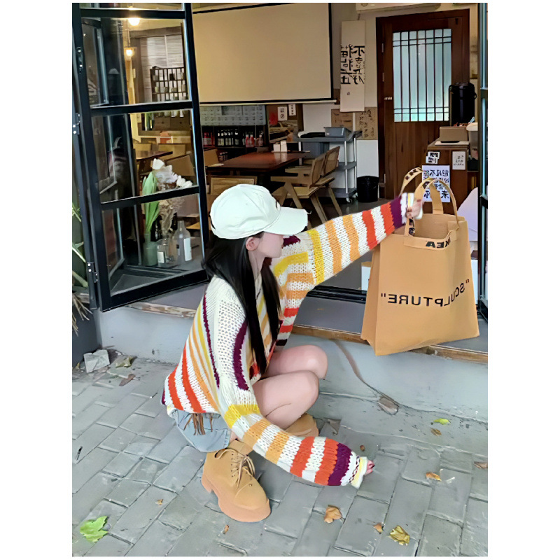 日系甜美慵懒风彩色条纹长袖毛衣女秋冬新款宽松圆领套头针织上衣