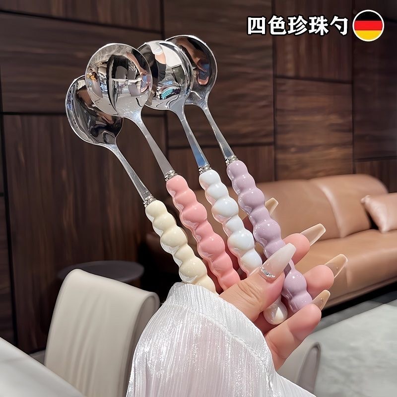 彩色珍珠勺不锈钢勺子塑料手柄餐勺少女心家用调羹小汤勺长柄圆勺