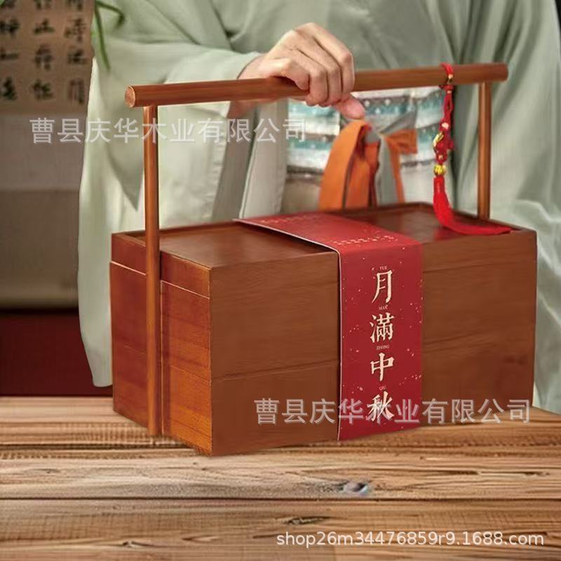 新中式木质月饼盒手提式双层实木月饼包装盒中秋节木制月饼礼品盒