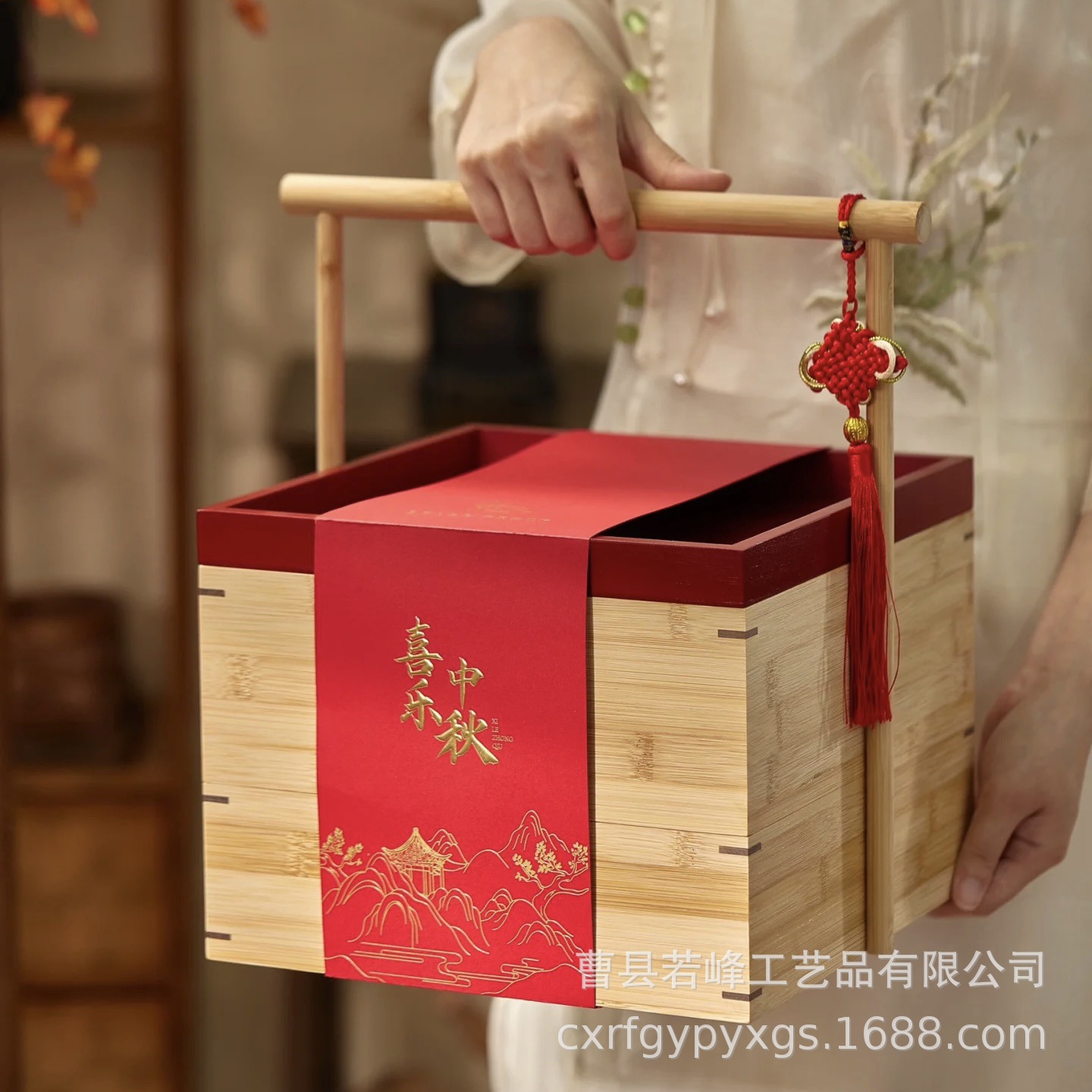 レトロな中秋節ギフトボックスポータブル二層スナックペストリー包装箱お土産バスケット食品ボックス月餅木箱
