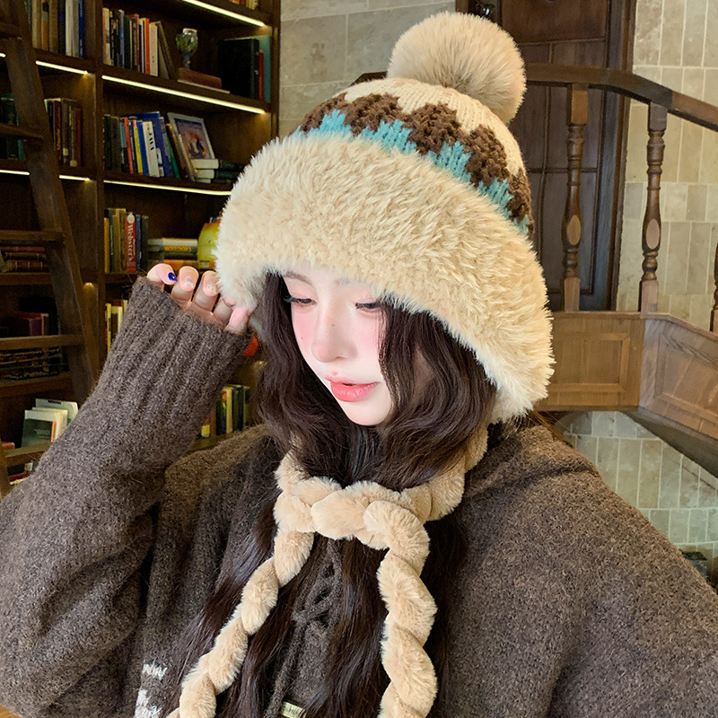 バラクラファー帽子秋冬保温ニット帽子女性ファッションマフラー一体ニット耳保護ウール帽子