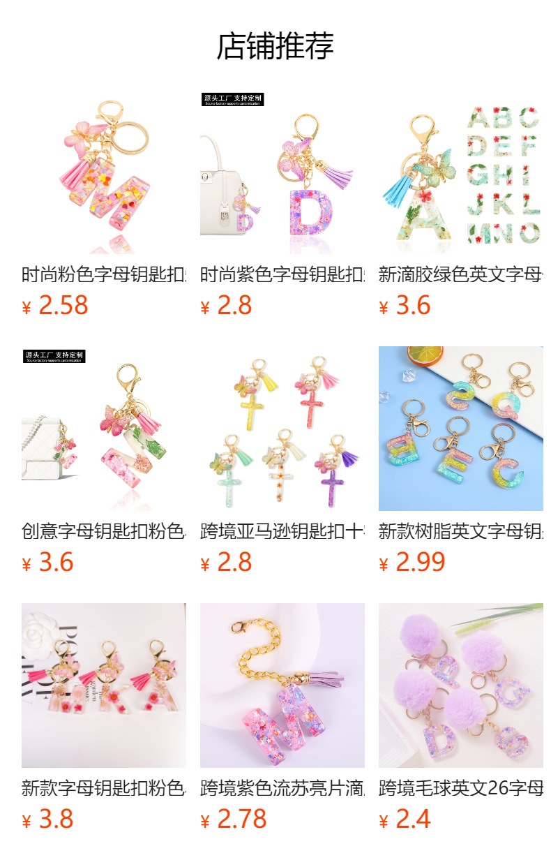 跨境蓝色系列26滴胶字母钥匙扣流苏配饰渐变蝴蝶亮片钥匙扣挂饰