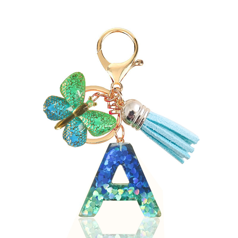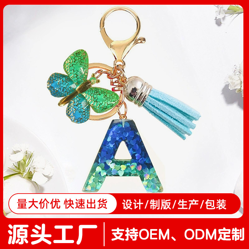 跨境热销青蓝色亮片树脂字母钥匙扣蝴蝶流苏钥匙链女士情侣小挂件