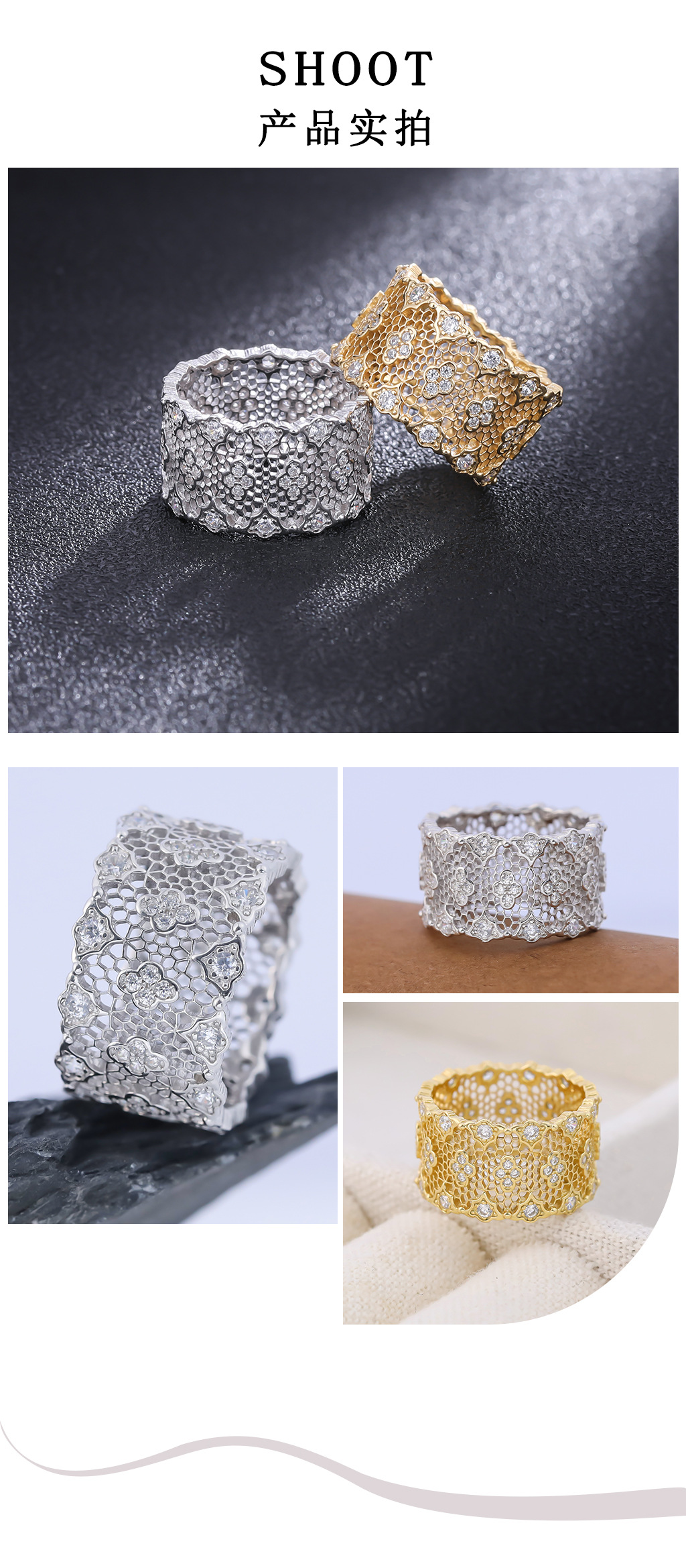 ライブで話題のシルバーアクセサリー新作S925純銀レースリング金メッキ中空メッシュリング女性用欧米風ワイドバージョン