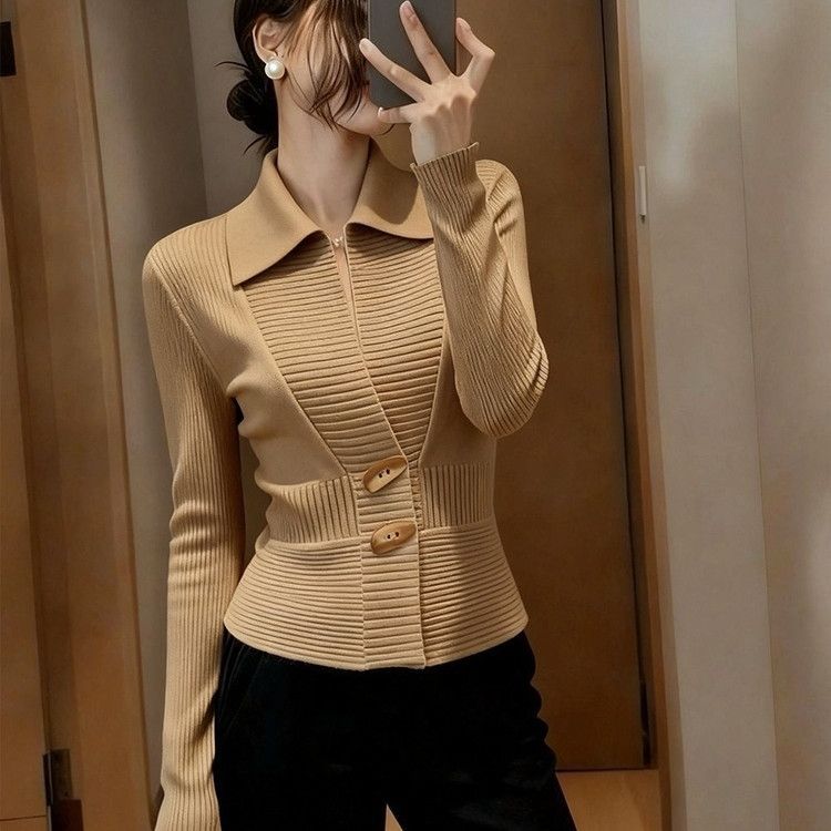 卡其色针织衫上衣女秋高端设计感独特漂亮减龄气质掐腰超好看毛衣