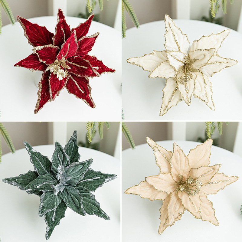 跨境temu爆款绒布酒红色圣诞花白色仿真花高档绿色香槟色一品红花