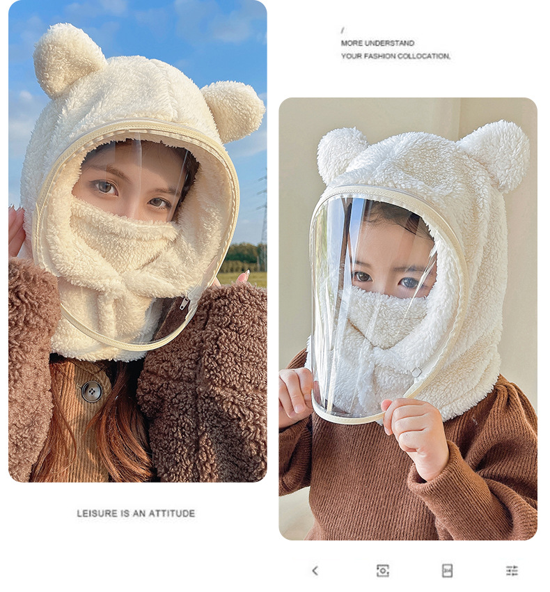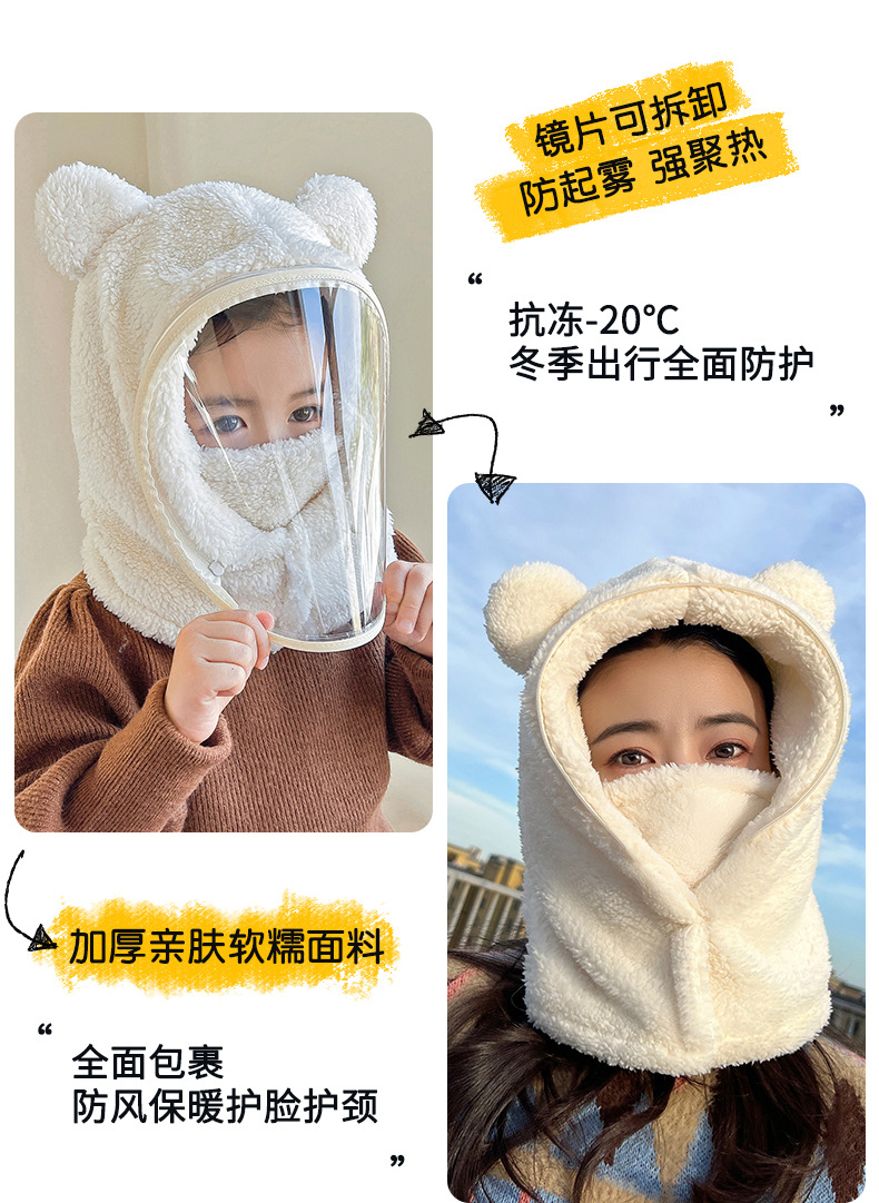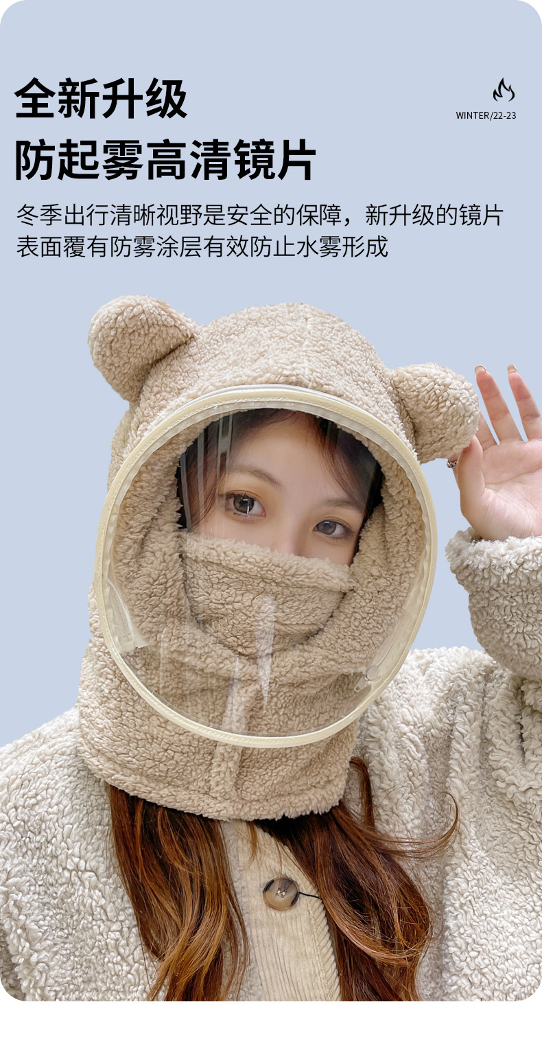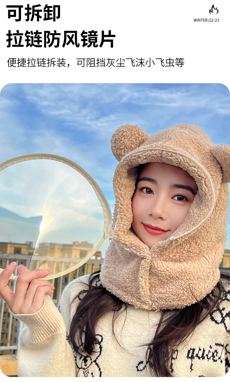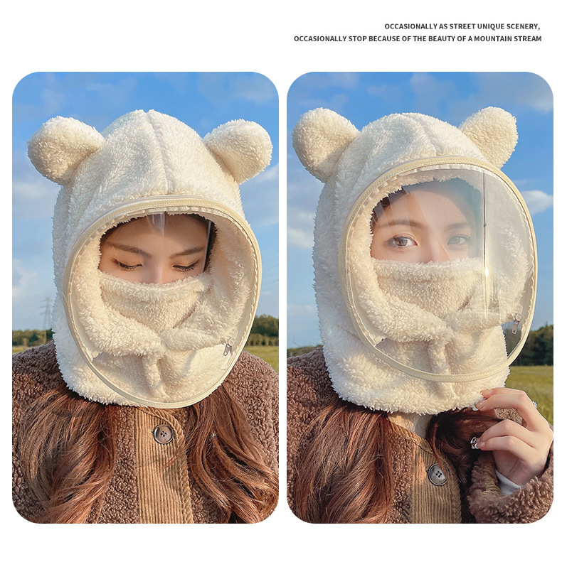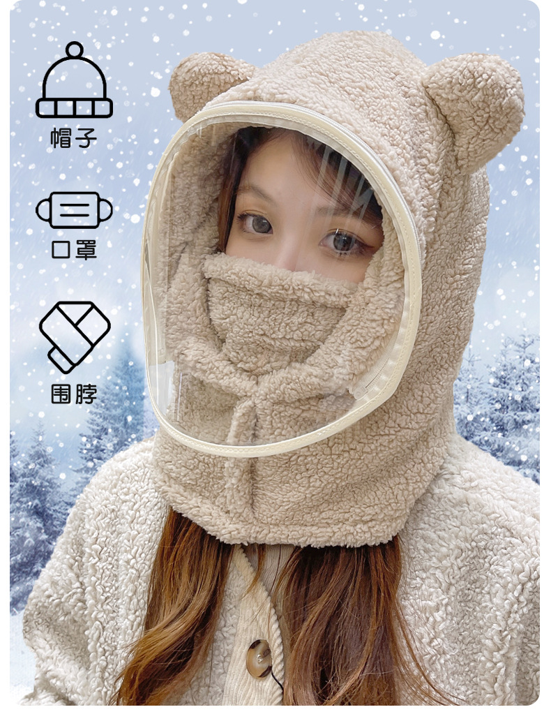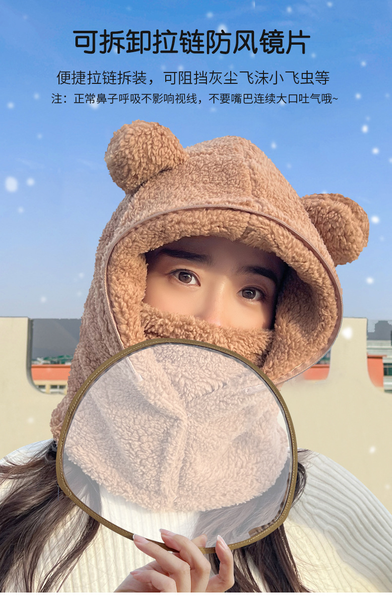 帽子女冬防风帽学生电动车保暖防风面罩可爱小熊围脖套头帽一体帽