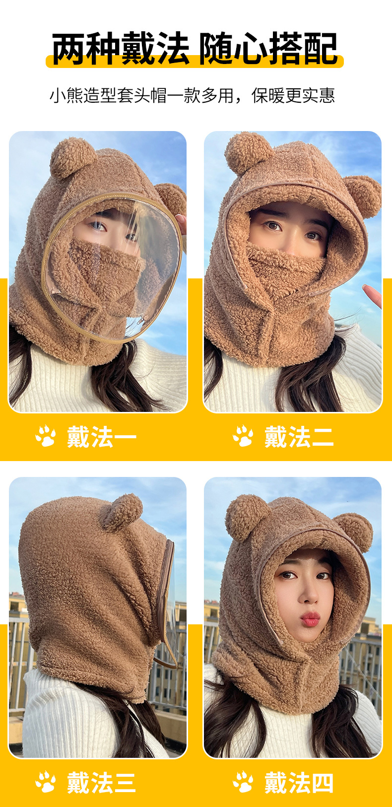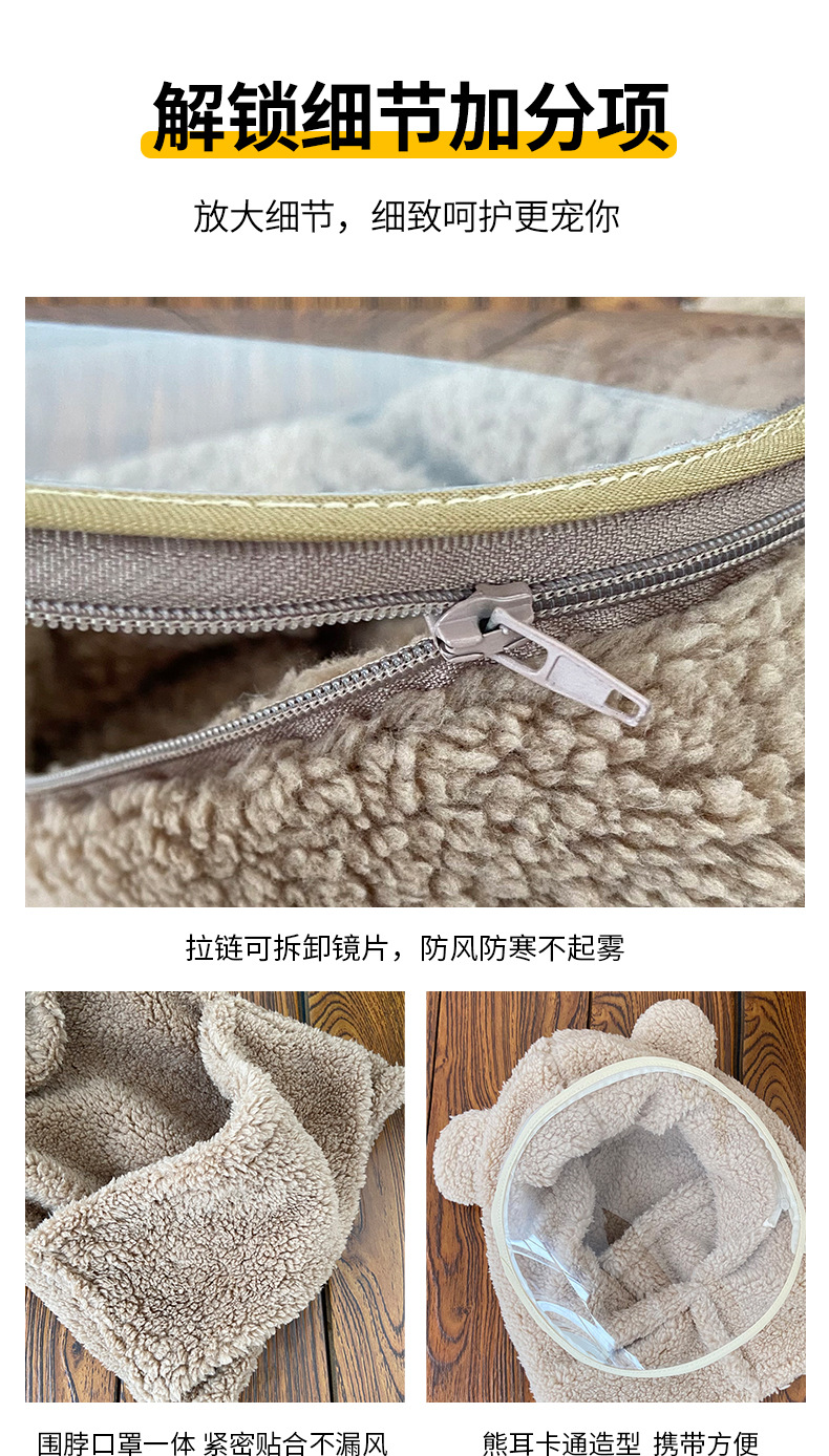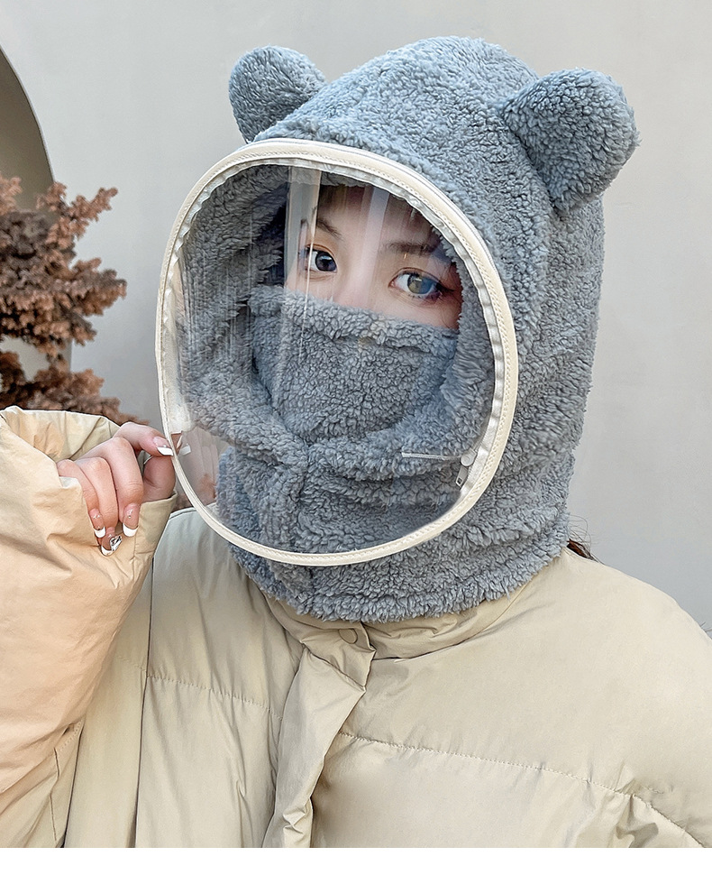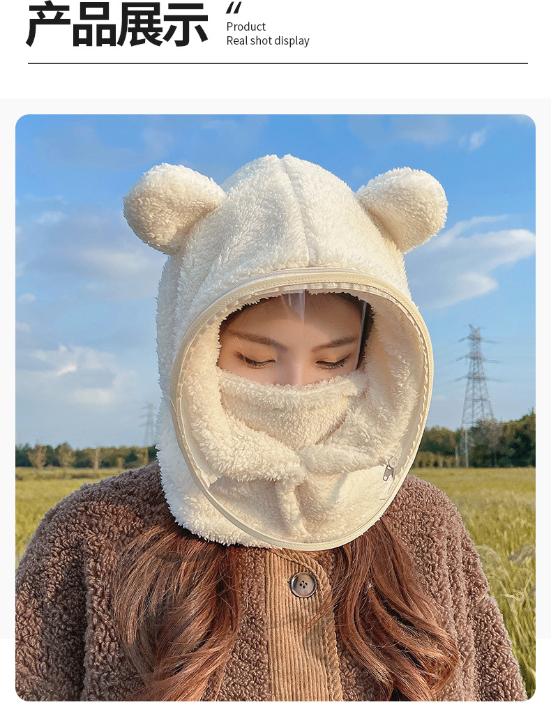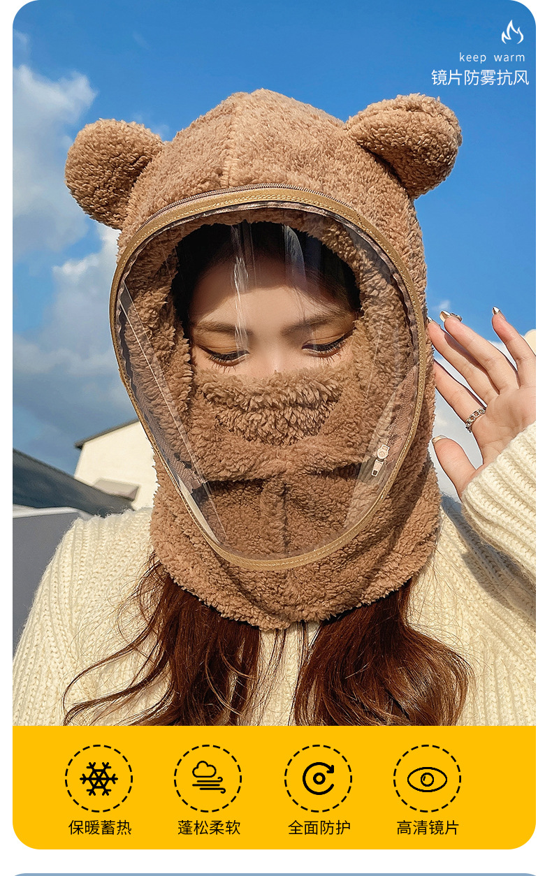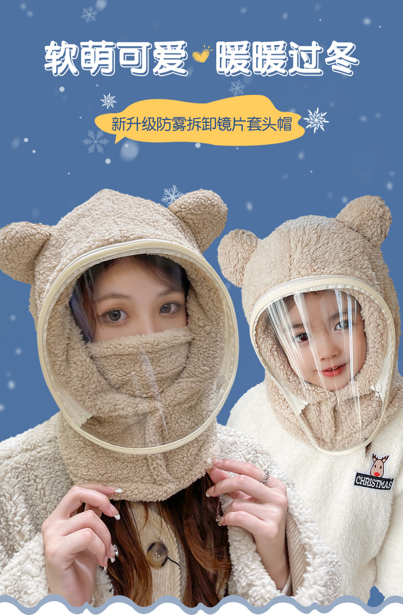 帽子女冬防风帽学生电动车保暖防风面罩可爱小熊围脖套头帽一体帽