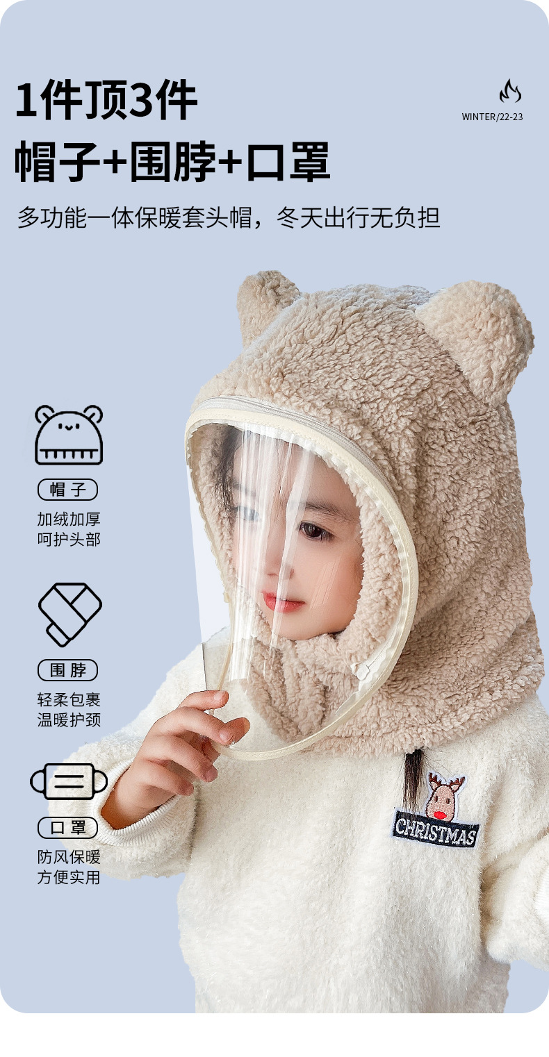 儿童帽子秋冬防风面罩男女童护耳一体套头帽挡风加厚保暖可拆卸