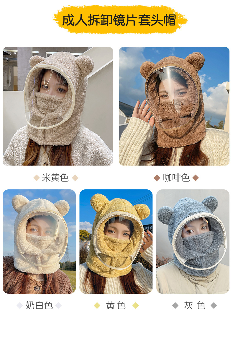 帽子女冬防风帽成人学生电动车保暖防风面罩小熊围脖套头帽一体帽