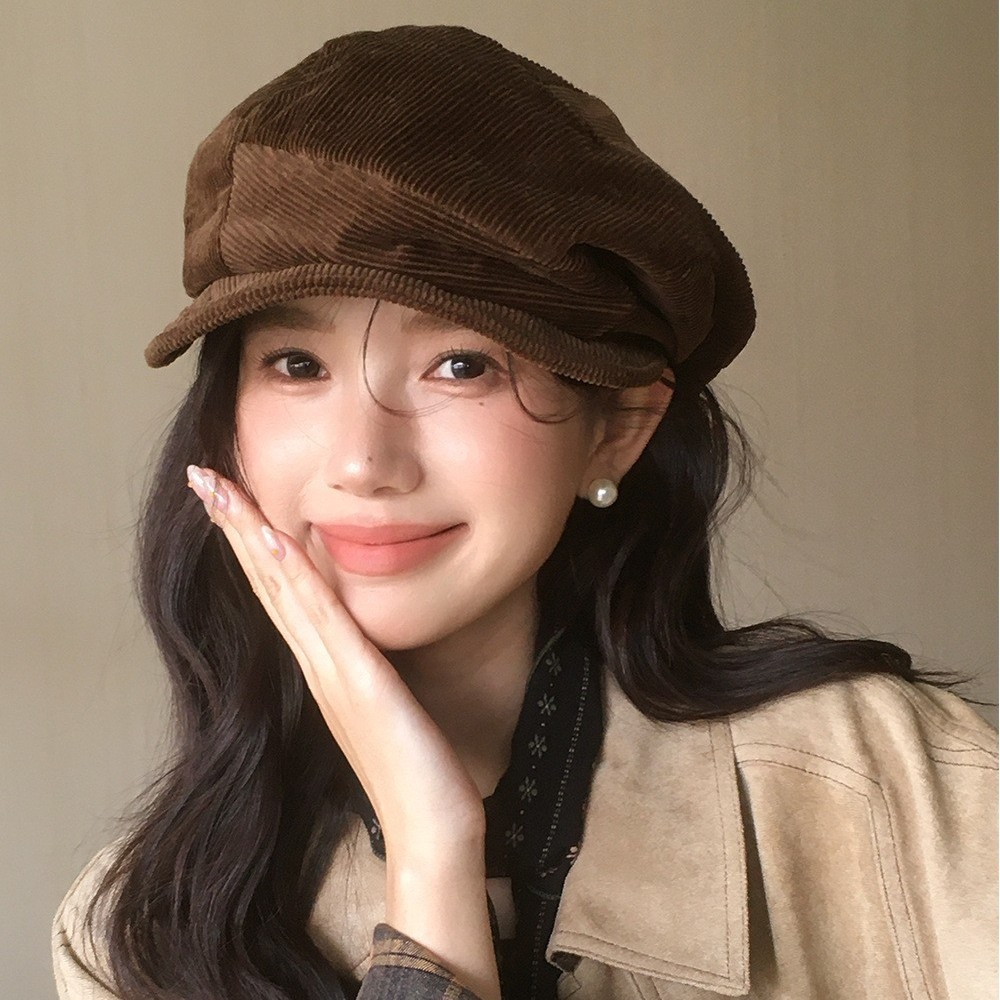 韩系覆古灯芯绒报童帽秋季咖啡色不规则画家帽时尚文艺宽檐贝雷帽