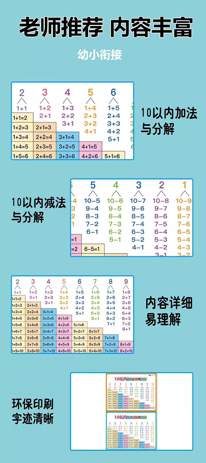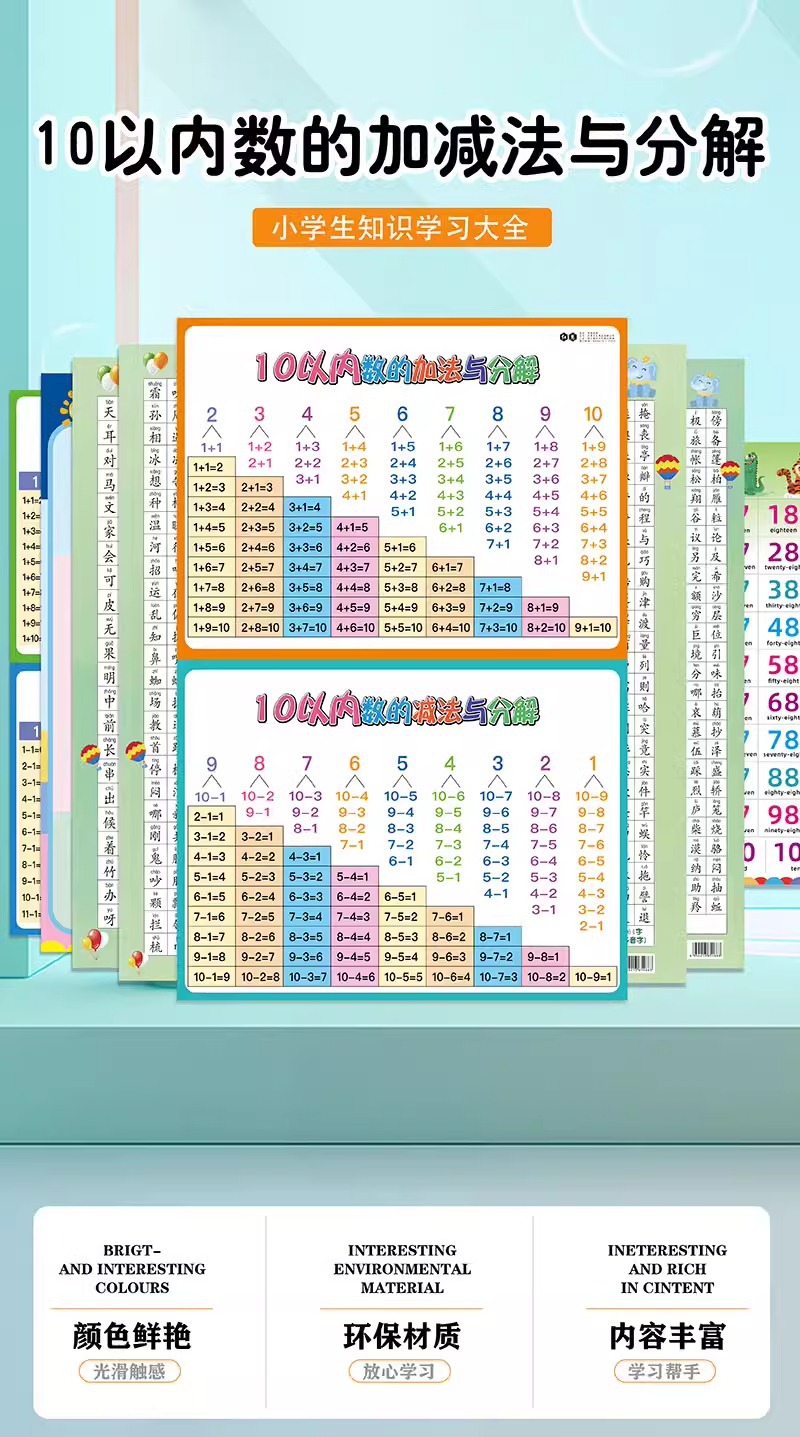 仕様 1枚】10以内の足し算・引き算・分解,2枚】10以内の足し算・引き算・分解+0~100の数字,写真2枚】10以内の足し算・引き算・分解+ピンイン,3枚】10以内の足し算・引き算・分解+20以内の足し算・引き算+ピンイン,4枚】10以内の足し算・引き算・分解+20以内の足し算・引き算+ピンイン+0~100の数字,6枚】10以内の足し算・引き算・分解+20以内の足し算・引き算+0-100+ピンイン+1年生の読み書き表,写真8枚】10以内の足し算・引き算・分解+20以内の足し算・引き算+0-100+ピンイン+1・2年生の読み書き表
