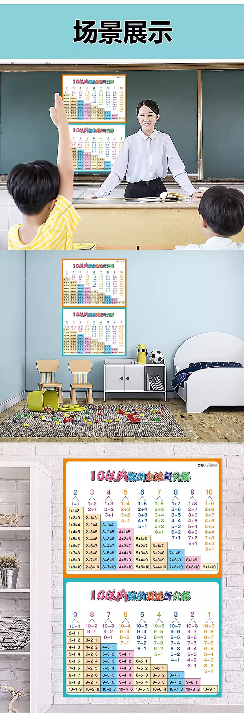 10以内のたし算・引き算の分解と図付き合成表、10のたし算と引き算の20枚のウォールステッカー壁掛けチャート