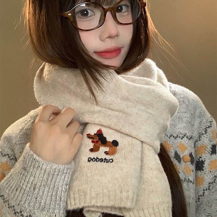 日系卡通可爱刺绣小狗围巾女秋冬季时尚保暖学生百搭针织护颈围脖