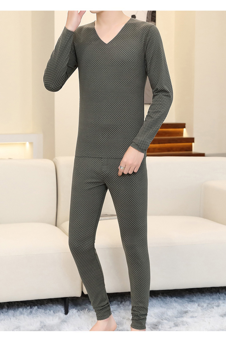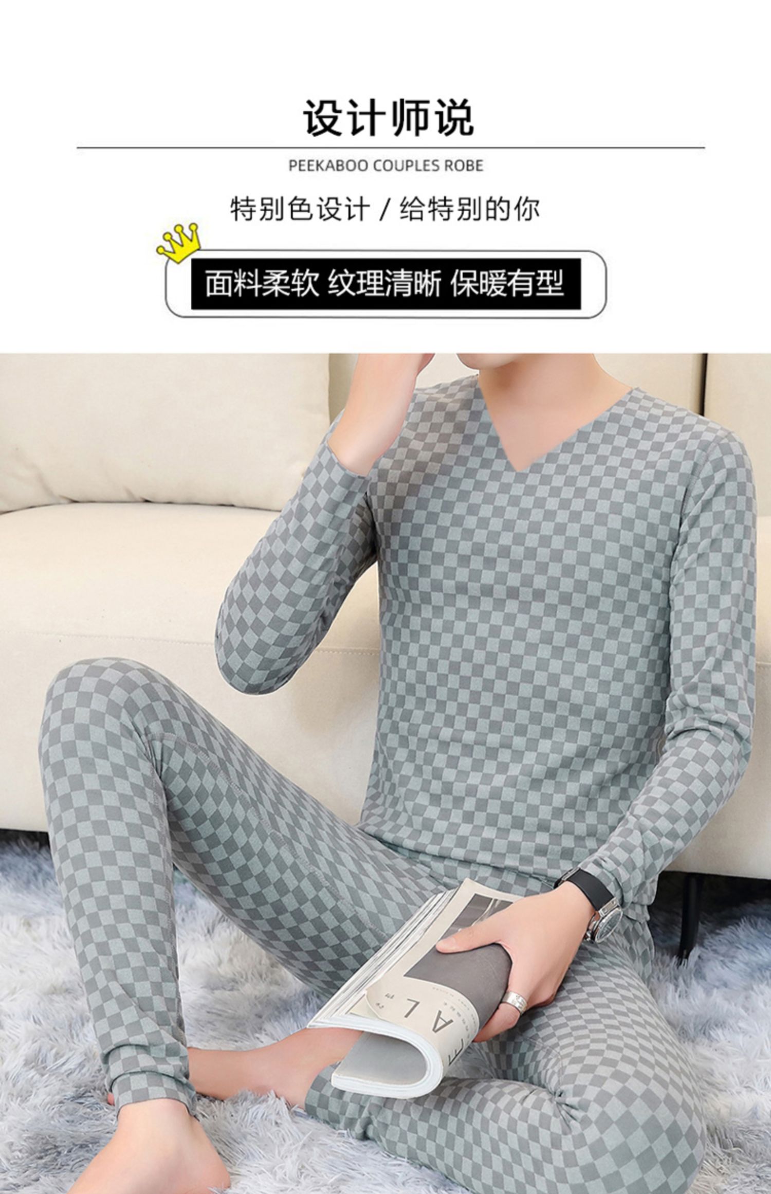 秋冬季新款薄款保暖内衣套装男士V领德绒无痕秋衣秋裤两件套衣服