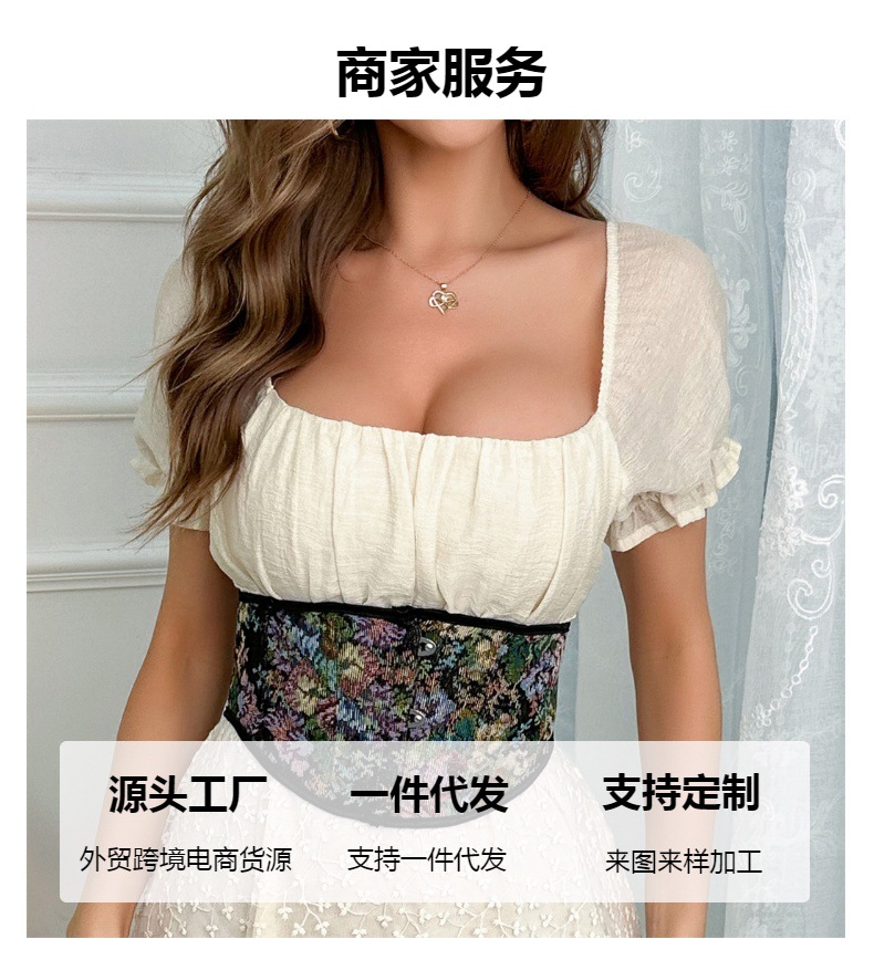 欧米の新型の女性は肩ベルトの茶色の宮廷の上着を持って腰の美しい体の服を収めて外に腰の復古の胸の服を着ます。