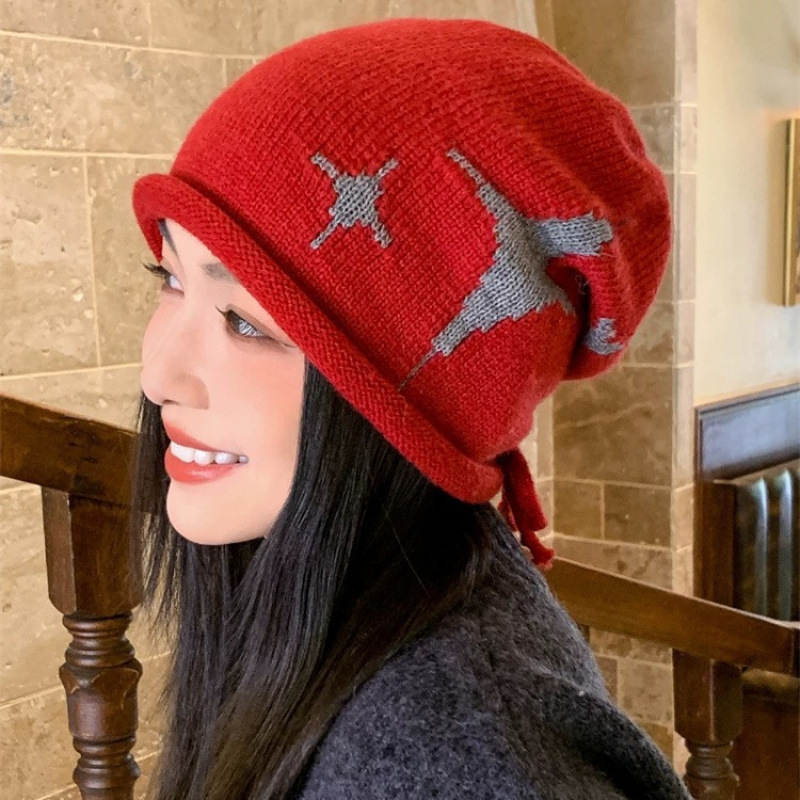 秋冬新款星星抽绳针织堆堆帽女韩版百搭休闲时尚显脸小护耳包头帽