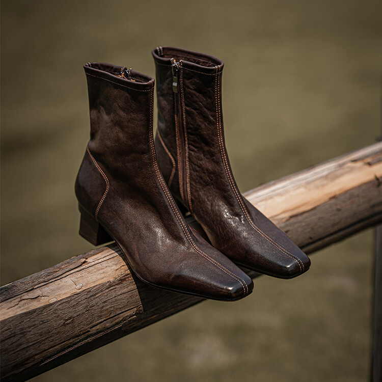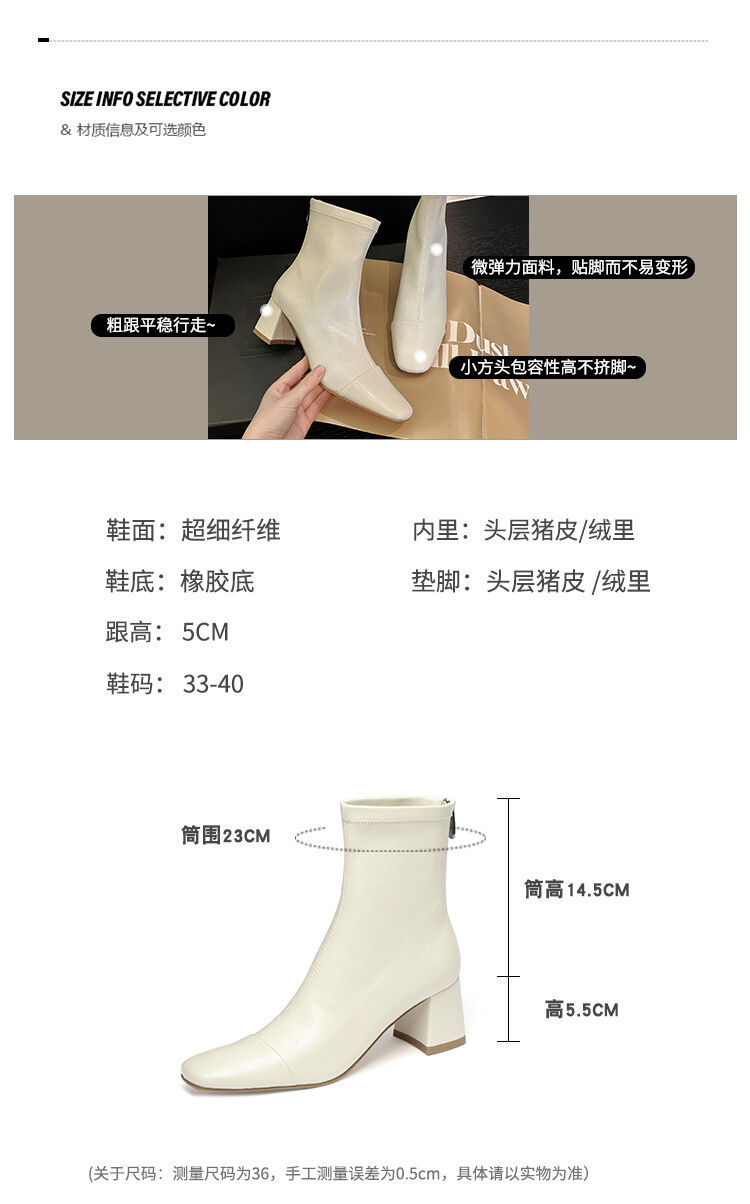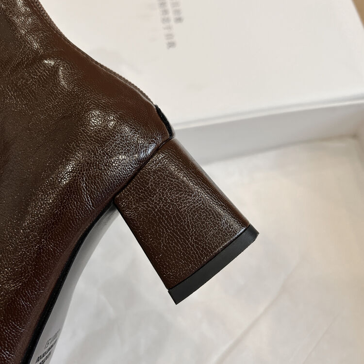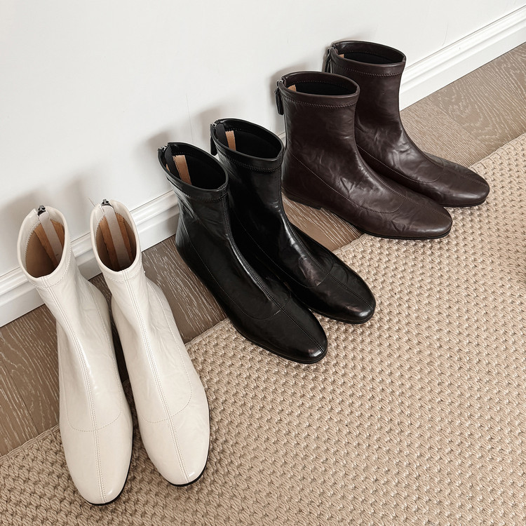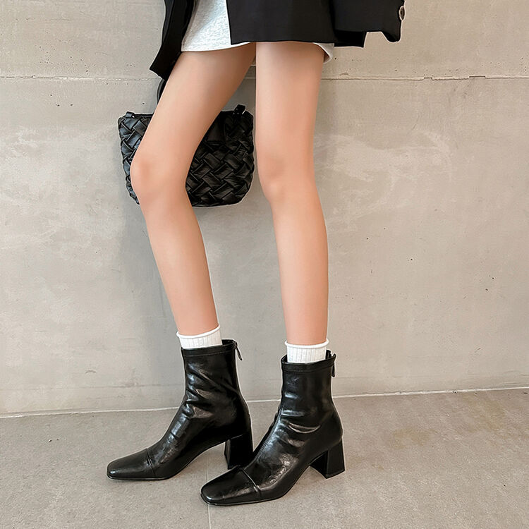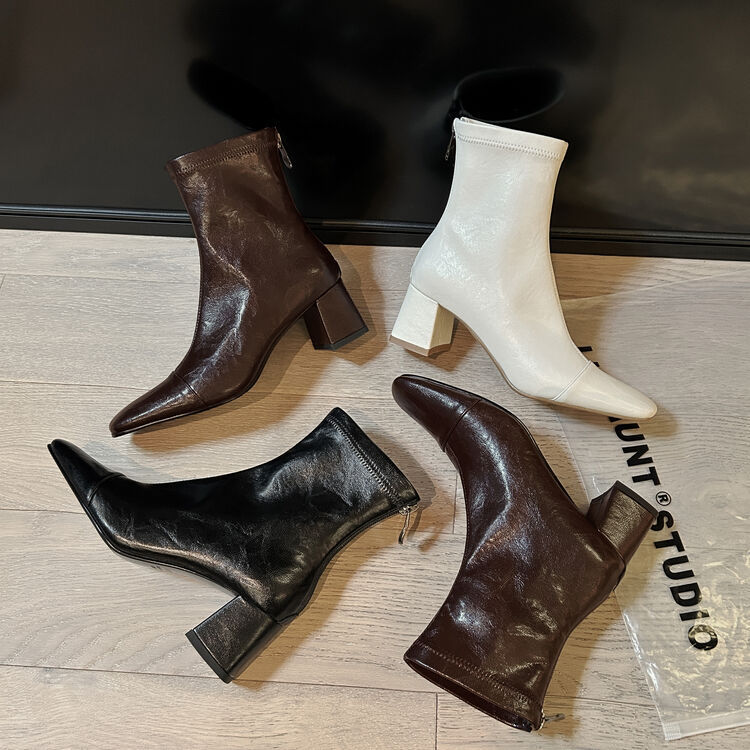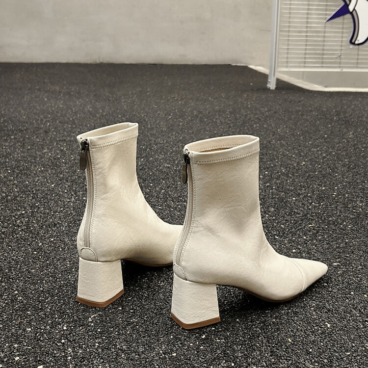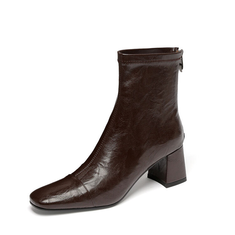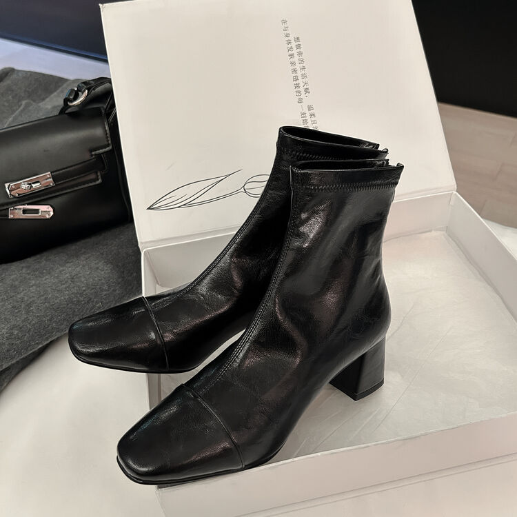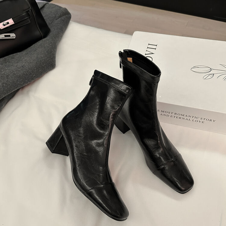 羊皮角頭ショートブーツ女性用シングルブーツ秋冬新作レトロ太ヒールハイヒール痩せ靴後ファスナー本革ブーツ