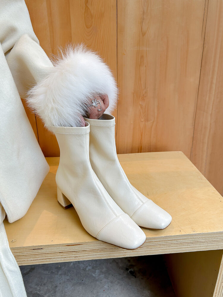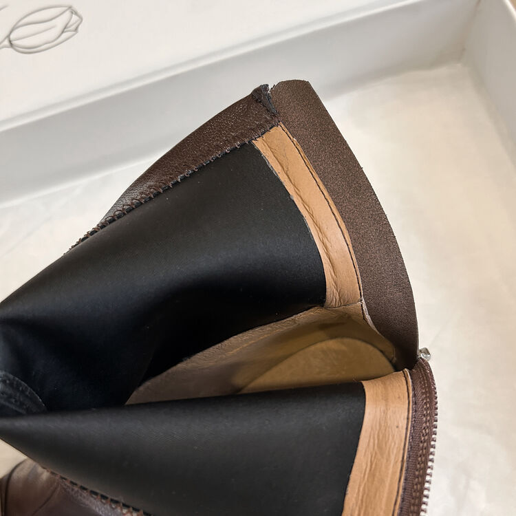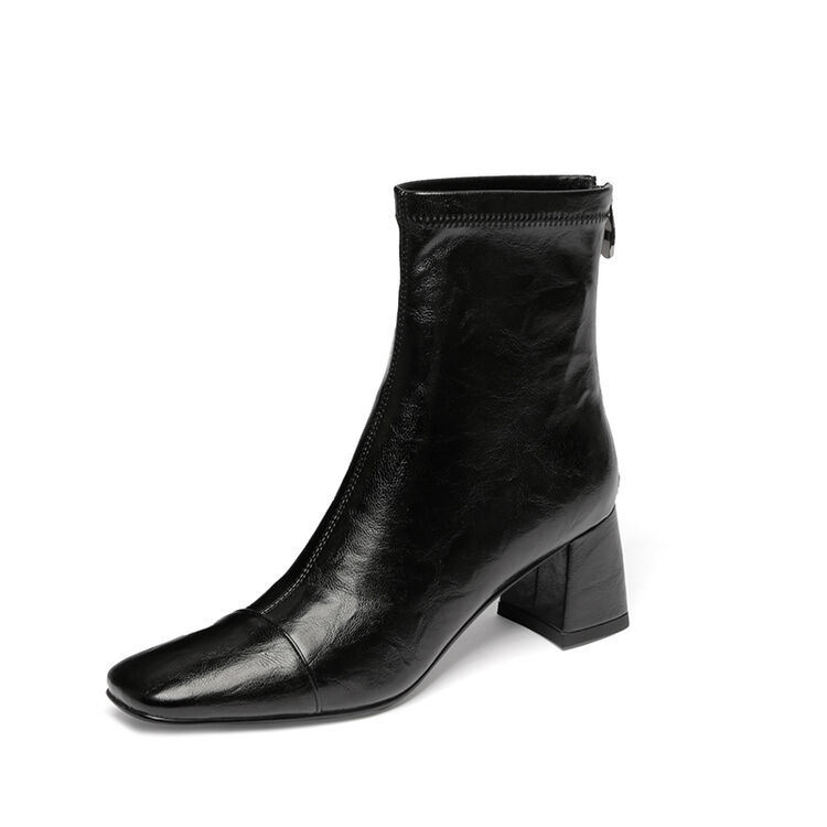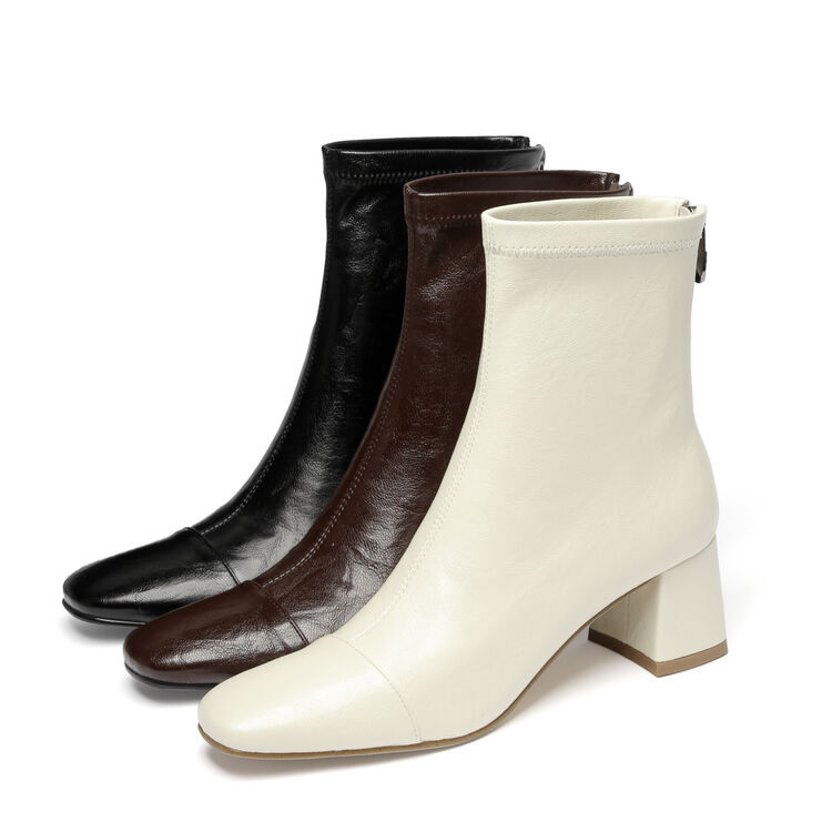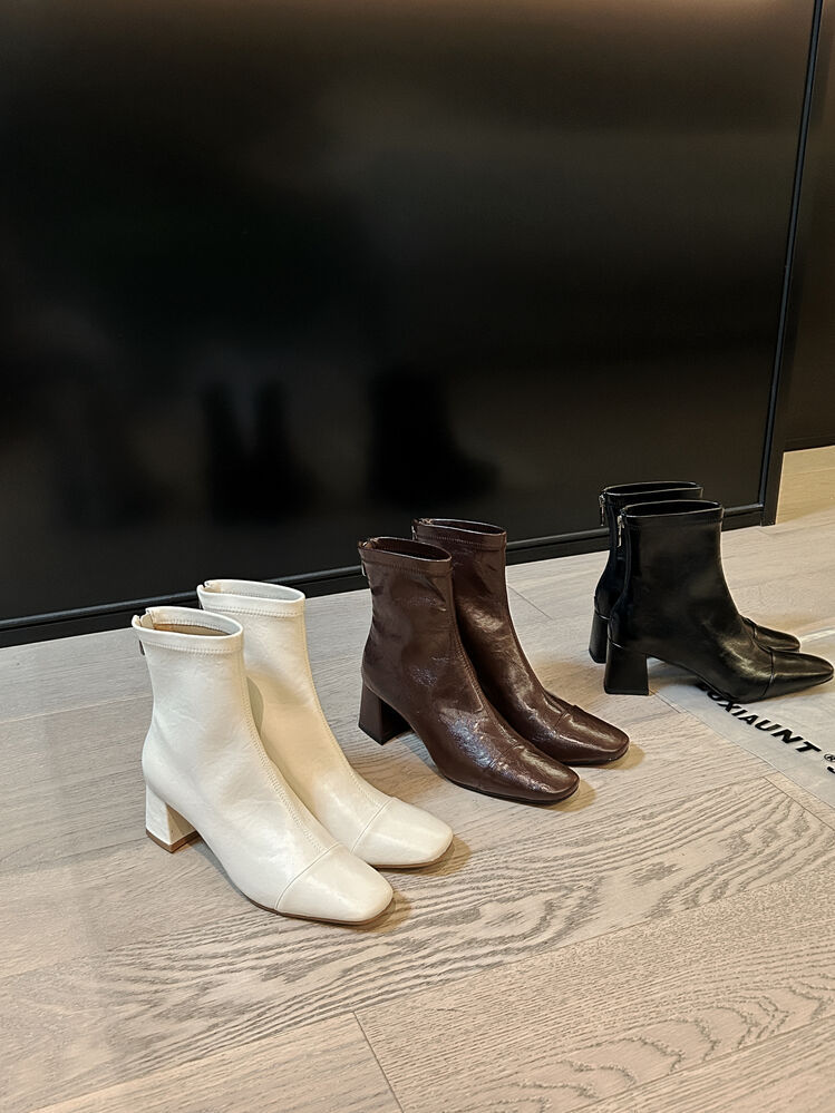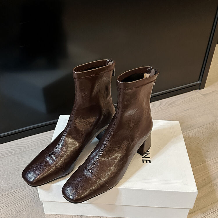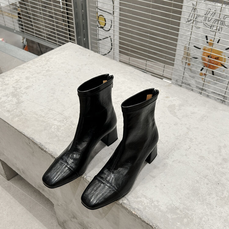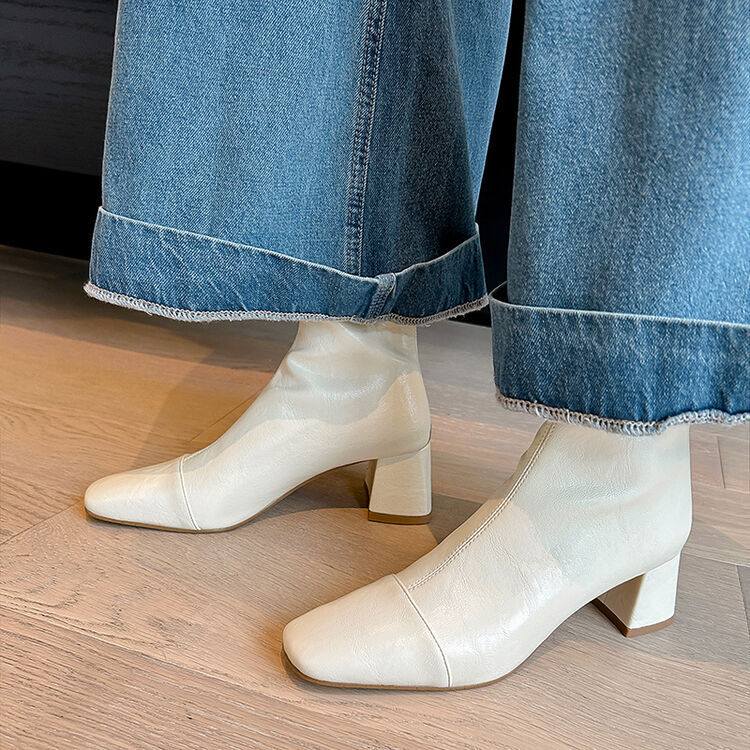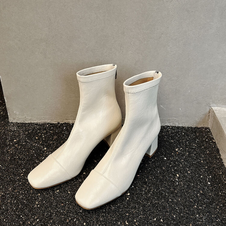 羊皮角頭ショートブーツ女性用シングルブーツ秋冬新作レトロ太ヒールハイヒール痩せ靴後ファスナー本革ブーツ
