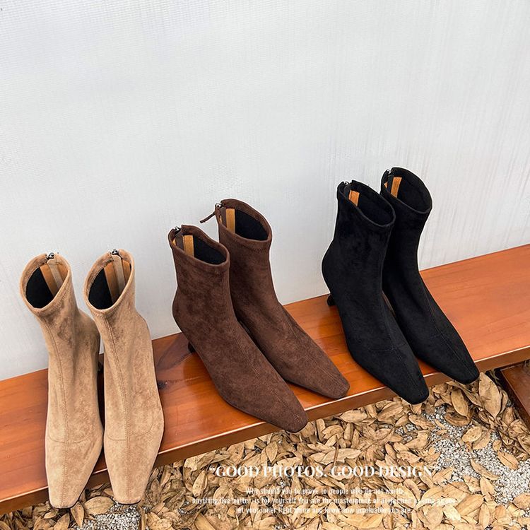 スエードの弾力性の靴の女性のやせているブーツの秋冬の新型の純色の韓国版の方頭の太いハイヒールの女性のショートブーツのシングルブーツ