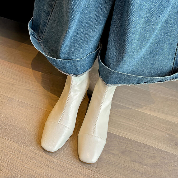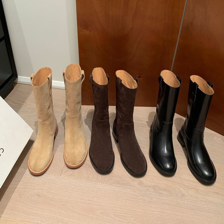 欧米風ワイドブーツ女性カジュアルブーツ秋冬新商品本革レトロ角頭スリーブ低ヒール女性用ミドルブーツ