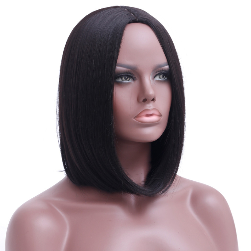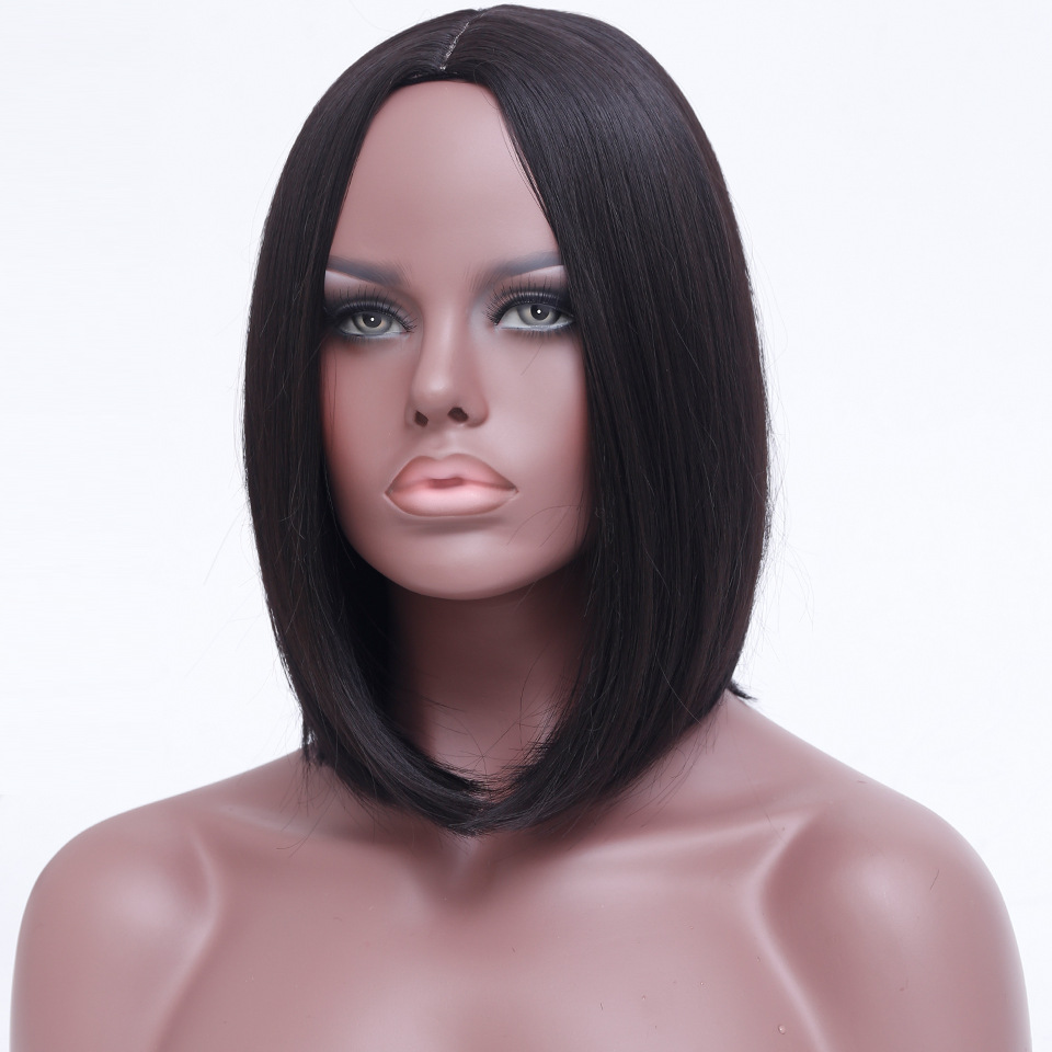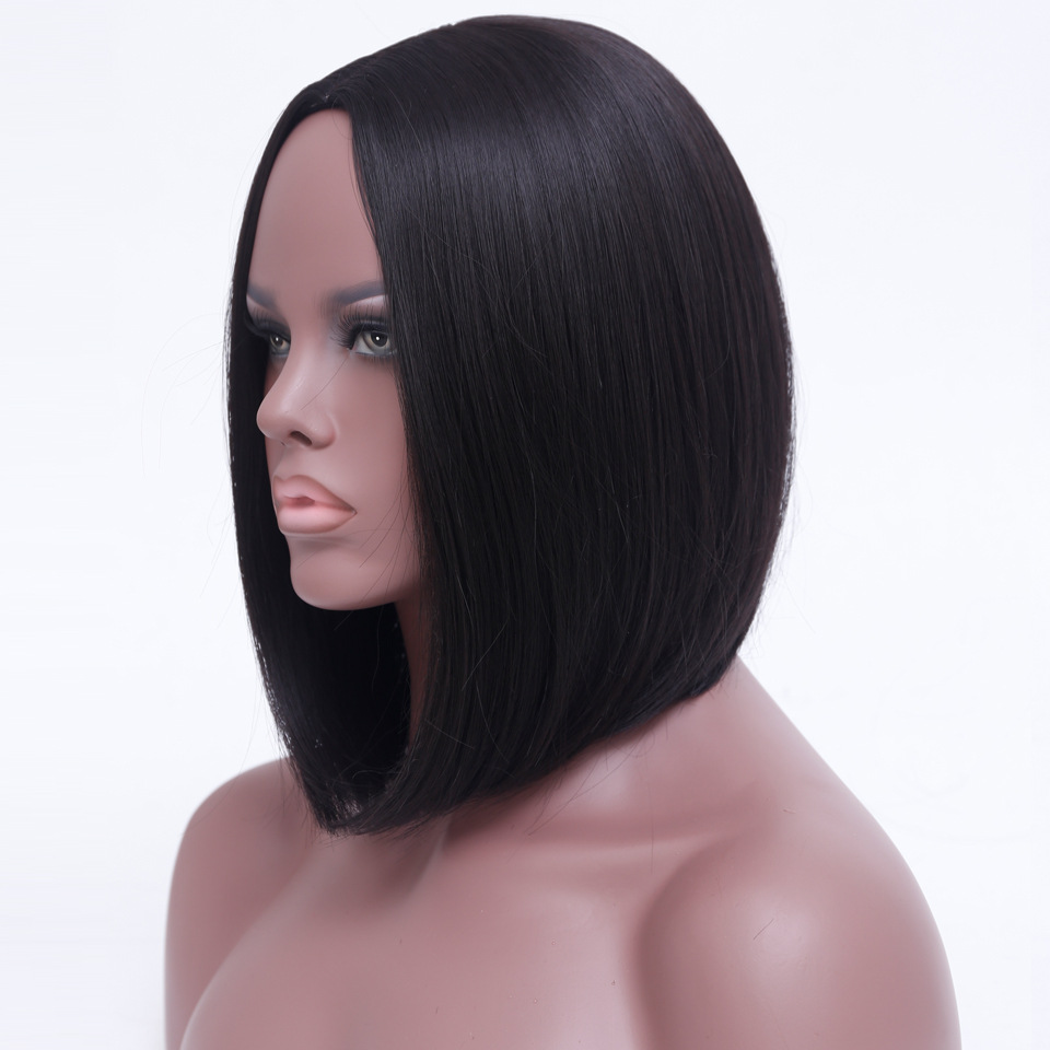 化粧品の特性 ヨーロッパとアメリカのかつら女性のための中分け波黒ショートストレートヘア機械製化学繊維かつらフルヘッドギアかつら
